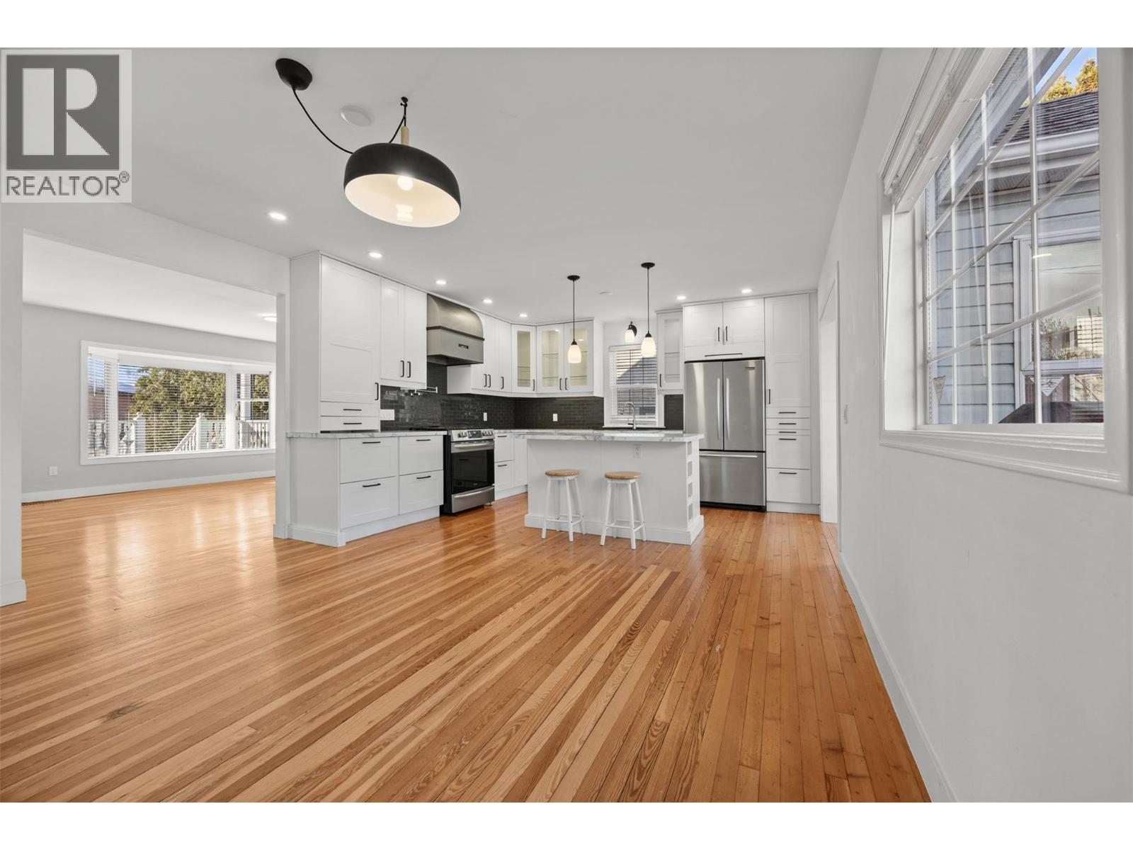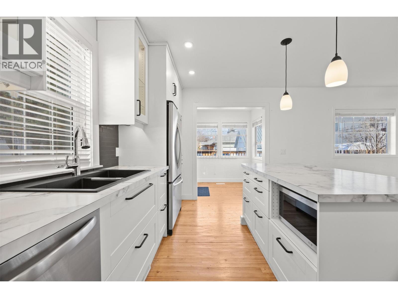 Discover this bright and inviting 4-bedroom, 2-bathroom home located in the heart of the highly sought-after Kelowna South neighborhood. Filled with character and modern updates, this south-facing property is situated on a RU6 zoned lot with carriage house potential. The home welcomes you through a bright foyer leading into a spacious living room. The modernized, airy kitchen features a door opening directly to the backyard. The main floor includes two well-sized bedrooms, one of which features french doors leading to the deck. Upstairs, you will find the primary bedroom, an additional bedroom, and a bathroom. The basement offers a finished den/flex room, laudry, while the remaining unfinished space provides a versatile area for a workshop or games room. You can enjoy entertaining outdoors on the large deck and appreciate maintenance-free living with synthetic turf in both the front and back yards. Parking & Storage includes a single-car garage 17'by 20'11"", a large shed, and a driveway with room for four cars or an RV. The laneway access offers future potential for a carriage home. Recent Updates include the AC and furnace that were replaced in 2017, and a new irrigation system was installed in 2023. The location is perfect as you are a short stroll from Kelowna’s best attractions, including pristine beaches, trendy restaurants, Pandosy Village, Okanagan College, downtown and the hospital. Outdoor enthusiasts will also appreciate the proximity to the Sutherland Transportation corridor. (id:58842)