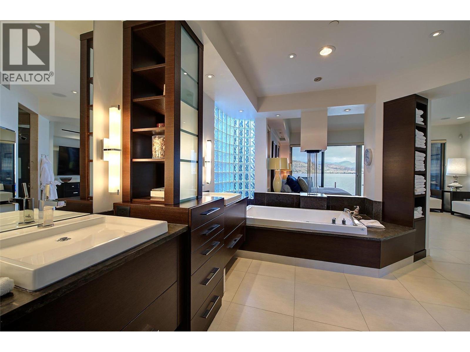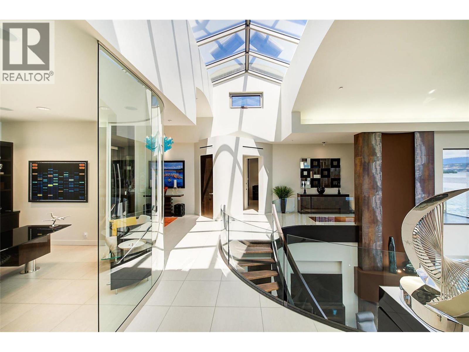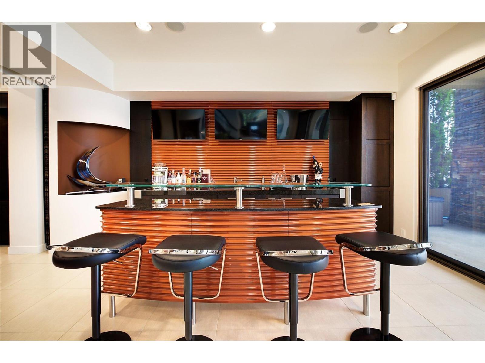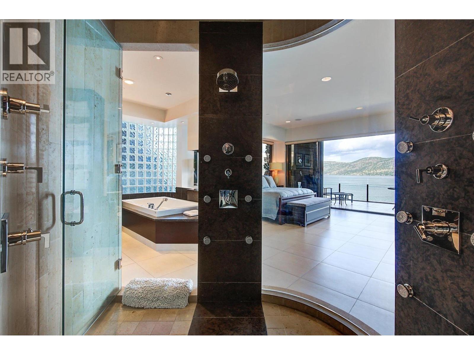 Nestled in the exclusive gated community of Sailview Bay, just 10 minutes from downtown Kelowna, this stunning 8,007 sq. ft. 4-bedroom, 8-bathroom estate is a true architectural gem. Designed with elegance and precision, it seamlessly blends luxury and comfort. From the moment you step through the grand glass entrance, the home’s quality and craftsmanship are undeniable. Spanning four levels with an elevator for easy access, it offers an exceptional layout. The upper level features three guest suites, each with their own private washroom, a laundry room, and a custom office. A tandem garage completes this level. The main floor is the heart of the home, boasting a spectacular primary suite with a spa-like ensuite and walk-in closet. A soaring great room with dramatic lake views flows into the dining area and gourmet kitchen. A secondary laundry and pantry ensure effortless functionality, while a second double garage provides easy access. Designed for entertaining, the lower level features a stylish bar, theatre room, and spa-inspired bath with a steam shower. Expansive patio doors open to an infinity pool, hot tub, and stunning outdoor lounge. Below, a private wine cave and poker room, carved into the cliffside, create a one-of-a-kind retreat. Waterfront amenities include a deep-water dock with two boat lifts, two Sea-Doo lifts, and a beachfront cabana with a private washroom. Offering luxury, privacy, and convenience, this is one of Okanagan Lake’s finest estates. (id:58842)