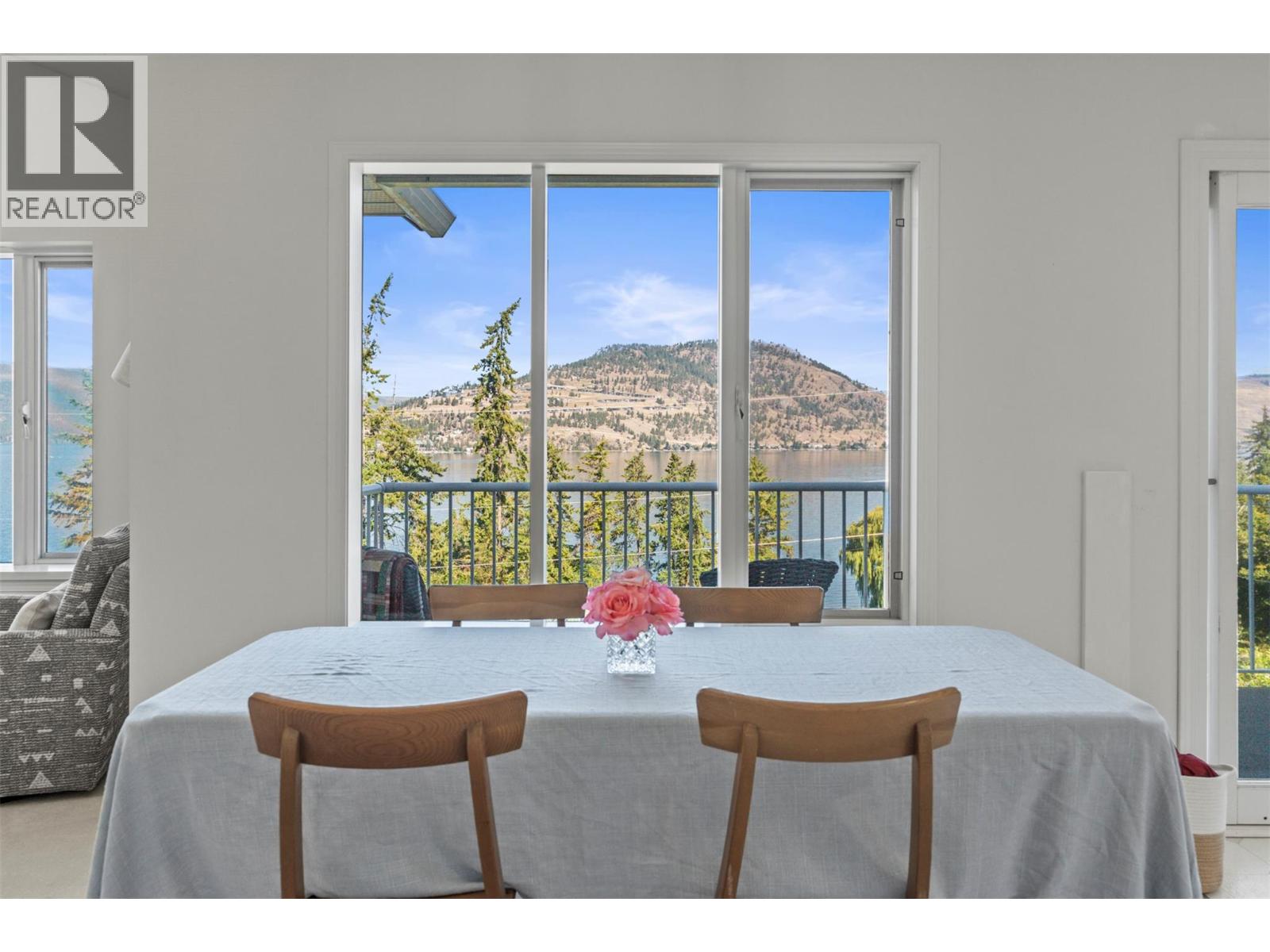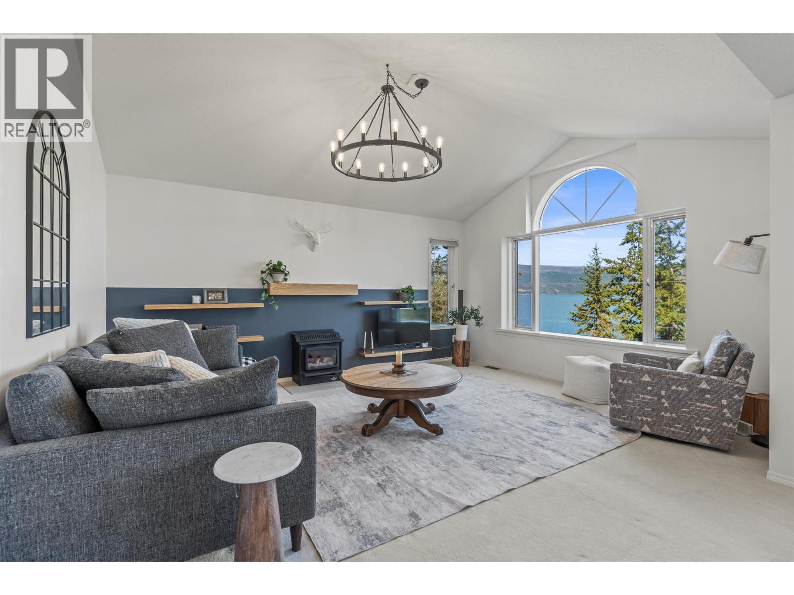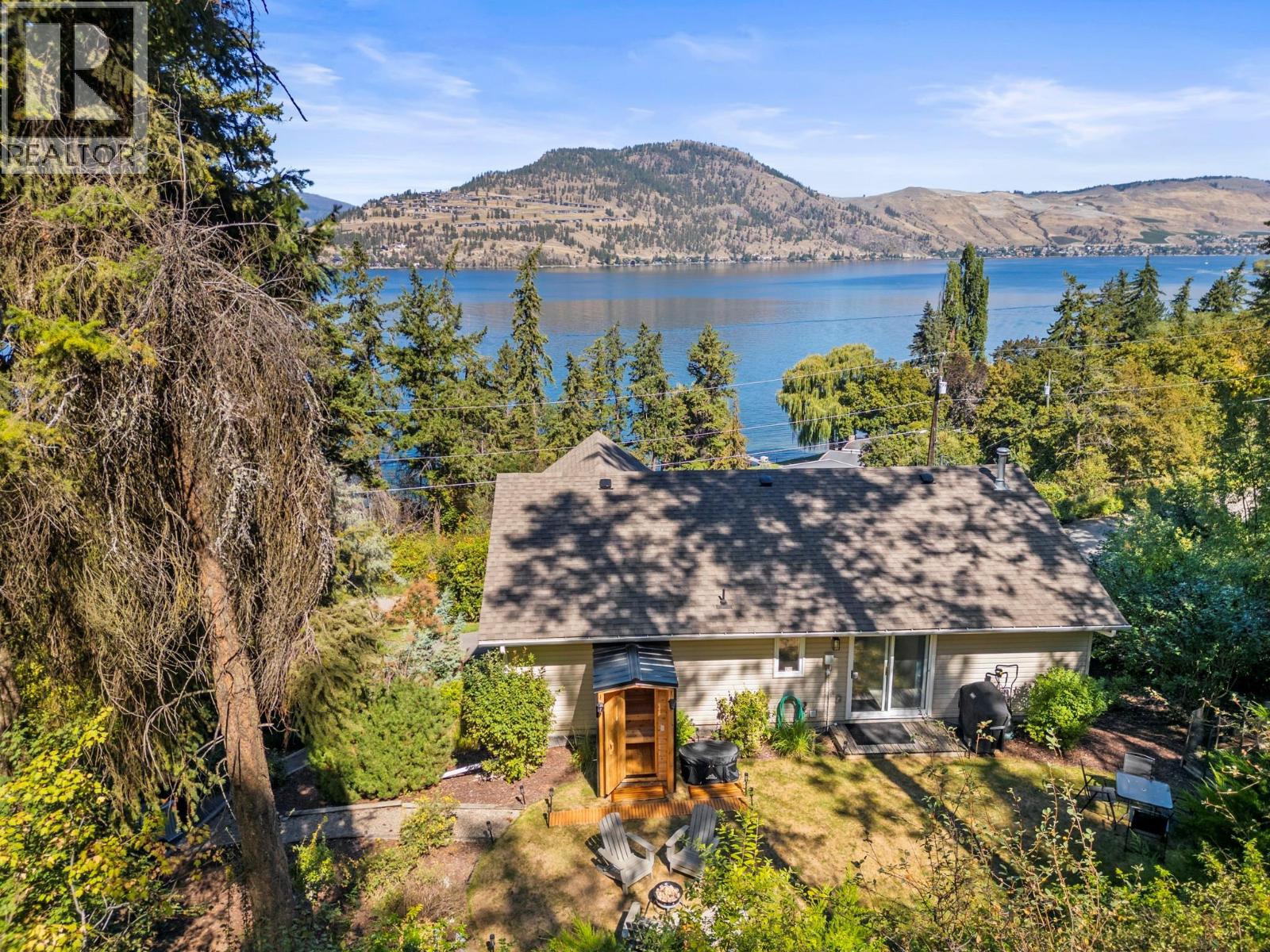 Lakeview, private with a mortgage helper! On a quiet no-through road, this two-story home offers exceptional tranquility and views of Okanagan Lake. The drive-through driveway provides convenience and ample parking, while the attached garage includes additional storage space with shelving. Inside, completely repainted, the upper-level boasts soaring vaulted ceilings and windows that frame the lake views. A cozy gas fireplace with floating shelves and updated lighting creates a warm, inviting atmosphere in the living area. The layout flows into a bright dining space with patio access where you can enjoy a morning coffee then through to the kitchen that features brand new appliances. The primary suite offers a private ensuite, double closet and lake views, while two additional bedrooms, a full bath, and laundry complete this upper level. Step outside to the private backyard, perfect for gardening, entertaining, or simply relaxing in a serene setting. The lower level hosts a self-contained one-bedroom, one-bathroom suite with its own separate entrance, fireplace and private laundry, ideal for guests (can be re-connected to main suite) or as a mortgage helper. Other updates in the home include: water on demand and roof in 2023 and the air conditioner and furnace were replaced in 2021. Located a short drive to Ellison Park, world-class golfing, bike to yacht club and local pub, and only 9 minutes from Vernon’s amenities (id:58842)