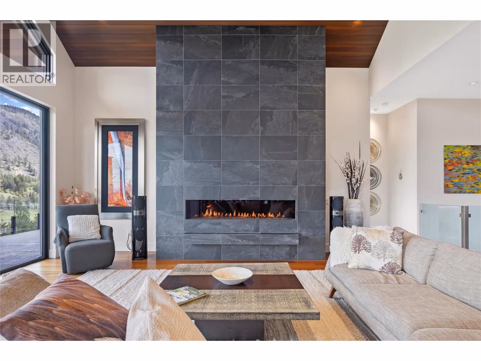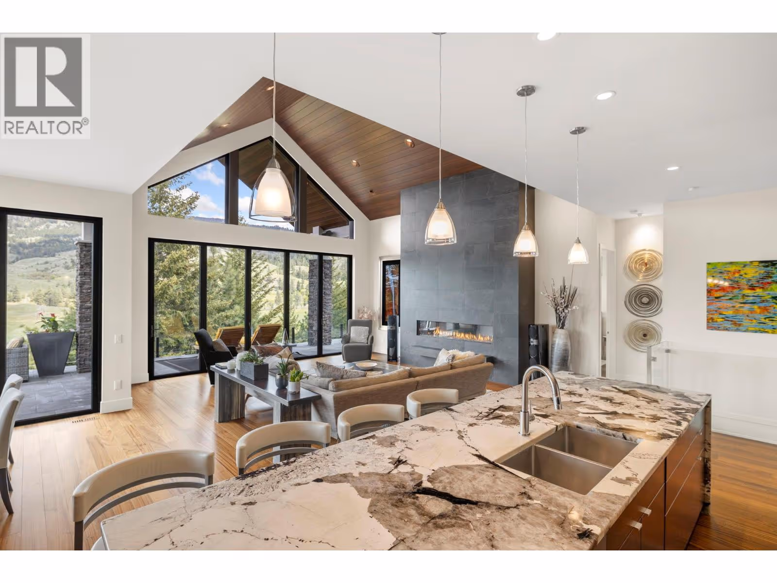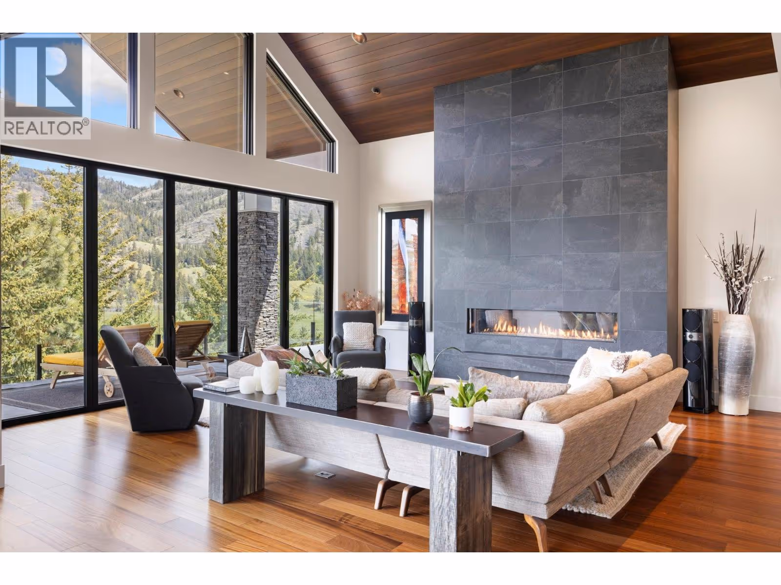 Experience unparalleled luxury and privacy in this 4,000+ sq ft, 4-bed, 3-bath masterpiece overlooking the golf course with sweeping mountain views and no front or rear neighbours. Superior in every detail, this home features spray foam insulation throughout, a fully engineered suspended garage slab with epoxy flooring and EV charging, and oversized decks considerably larger than most in the neighbourhood. Inside, 48 feet of Nano doors seamlessly blend indoor and outdoor living, highlighting vaulted ceilings with a 6-ft HeatnGlo fireplace with dual-vent system to warm the lower level or vent outside, Canadian-made Sapele hardwood, art lighting, and Lutron controls. The chef’s kitchen boasts an oversized granite waterfall island, walk-in pantry, pot filler, coffee station, and under-cabinet lighting. The primary suite offers Nano doors to the deck, a spa-like ensuite with heated floors, steam shower, custom tiling, and a granite-topped walk-in closet island. The lower level is built for entertaining with a theatre featuring a 110"" screen and tiered seating, a wine room, wet bar with dishwasher, office with barn doors, and walk-out to a private covered patio with hot tub, frameless glass railings, privacy screens, and outdoor speakers. Dual-zone HVAC, cork flooring, surround sound, heated bathroom floors, irrigation system, ultra-quiet garage openers, a water feature, and art lighting throughout complete this one-of-a-kind residence. (id:58842)
