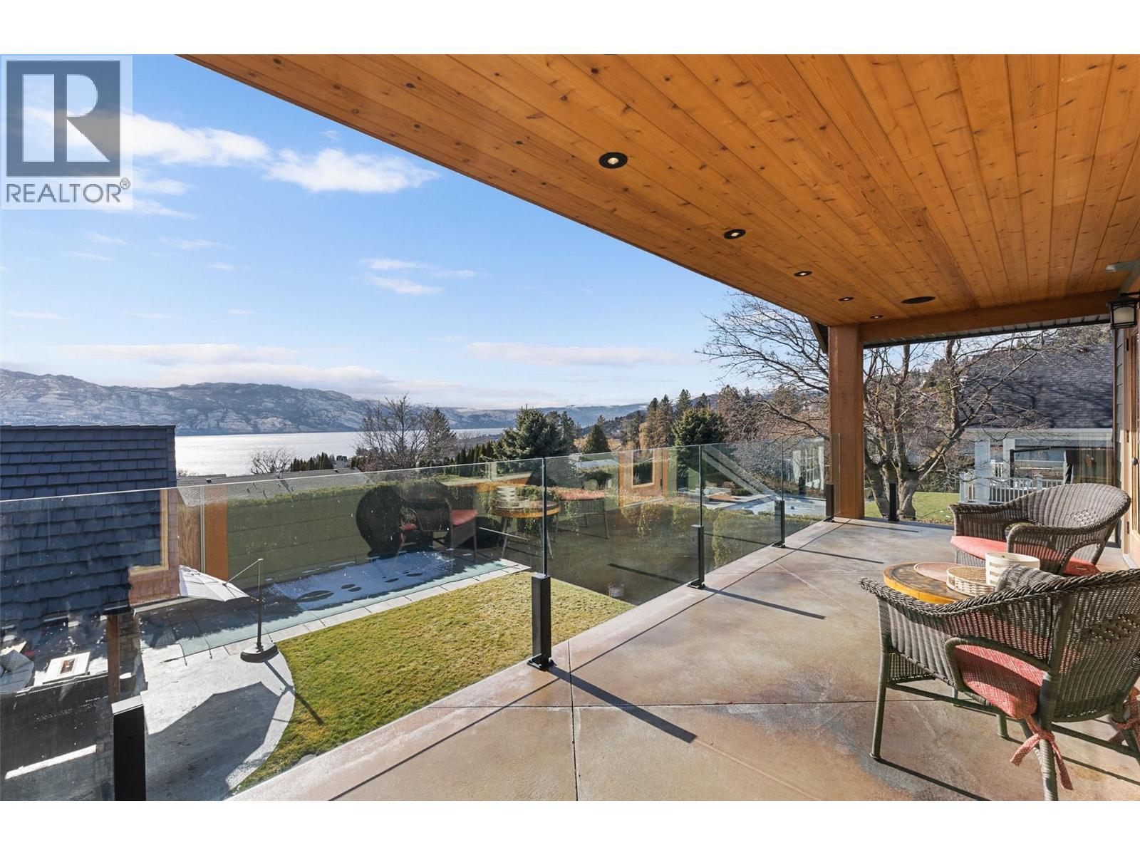 Set on a private 0.36-acre lot in the heart of West Kelowna’s wine country, this West Coast Craftsman offers an exceptional blend of luxury and versatility. Framed by stone, cedar and fibre cement, the home showcases strong architectural lines, soaring ceilings and quality finishes, hickory plank hardwood, cherry and bamboo cabinetry, fir doors and premium quartz and granite throughout. Designed for gathering, the main level opens to a chef’s kitchen with titanium black granite, Culinarian 6-burner gas range, Miele steam oven and expansive island, all flowing seamlessly to dining and living spaces with in-ceiling audio and Lutron lighting. A covered patio off the dining room extends to an spacious covered deck with a hot tub. The backyard features a saltwater sports pool and multiple lounge areas surrounded by stamped concrete, cedar privacy hedging and wired, covered patios with wood inlay ceilings, speakers and gas hookups, crafted for effortless entertaining. Upstairs, the primary suite is a sanctuary with fireplace, private covered deck and spa-inspired steam ensuite. Three additional beds complete the upper level. A suite above the garage offers income or guest flexibility, while the detached pool house, with bed, bath, kitchenette and separate garage/workshop, adds rare multigenerational potential. With RV parking, wine cellar, climate control systems and walking access to Boucherie Road’s trail, wineries and beaches, this is refined Okanagan living. (id:58842)