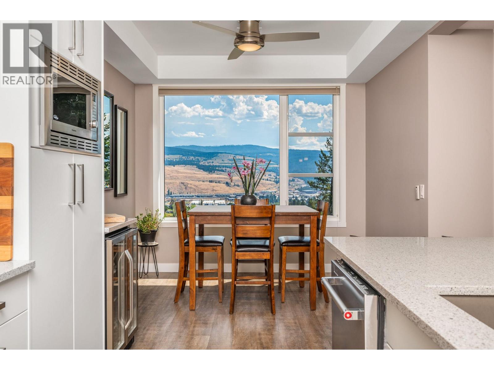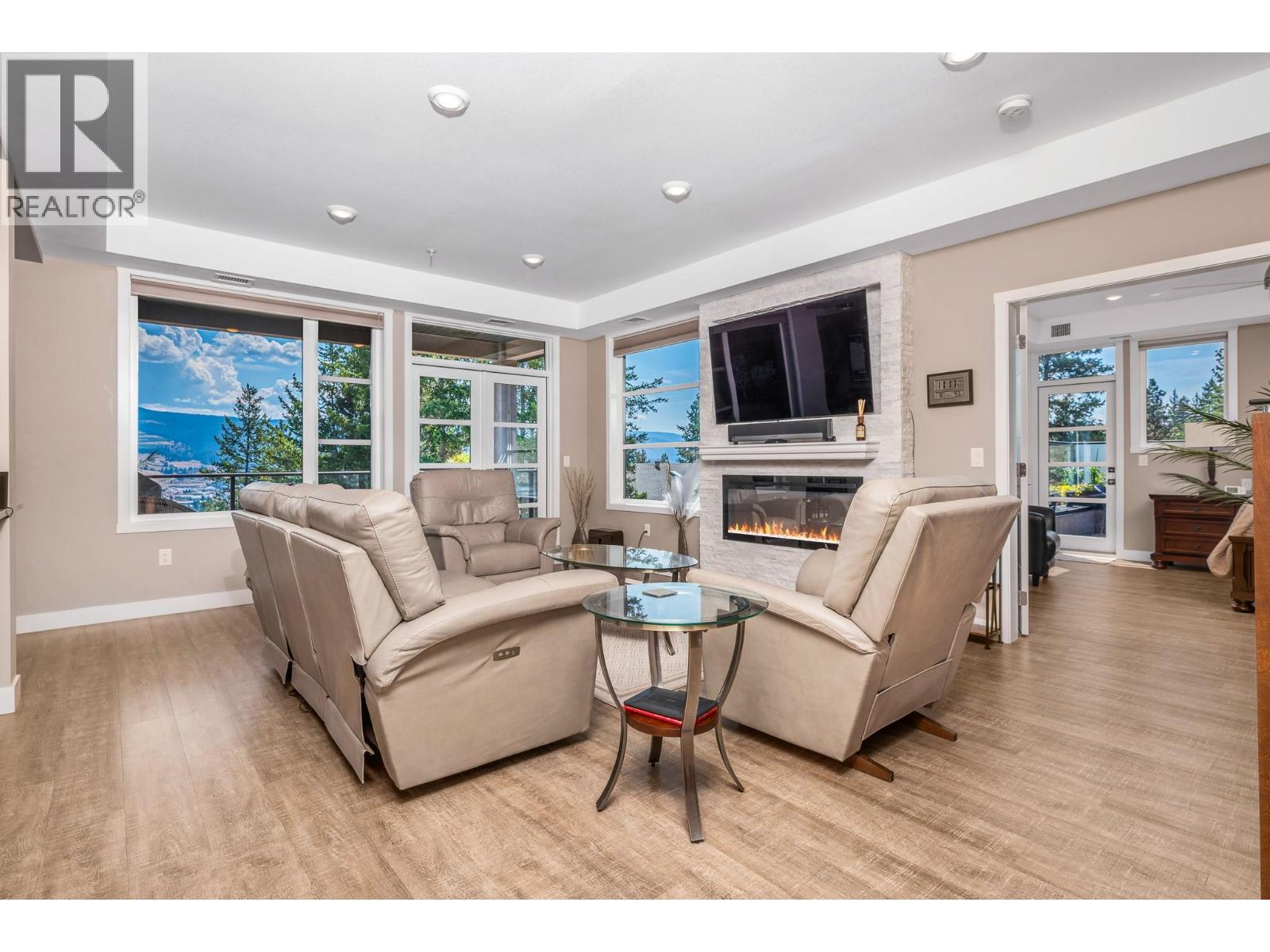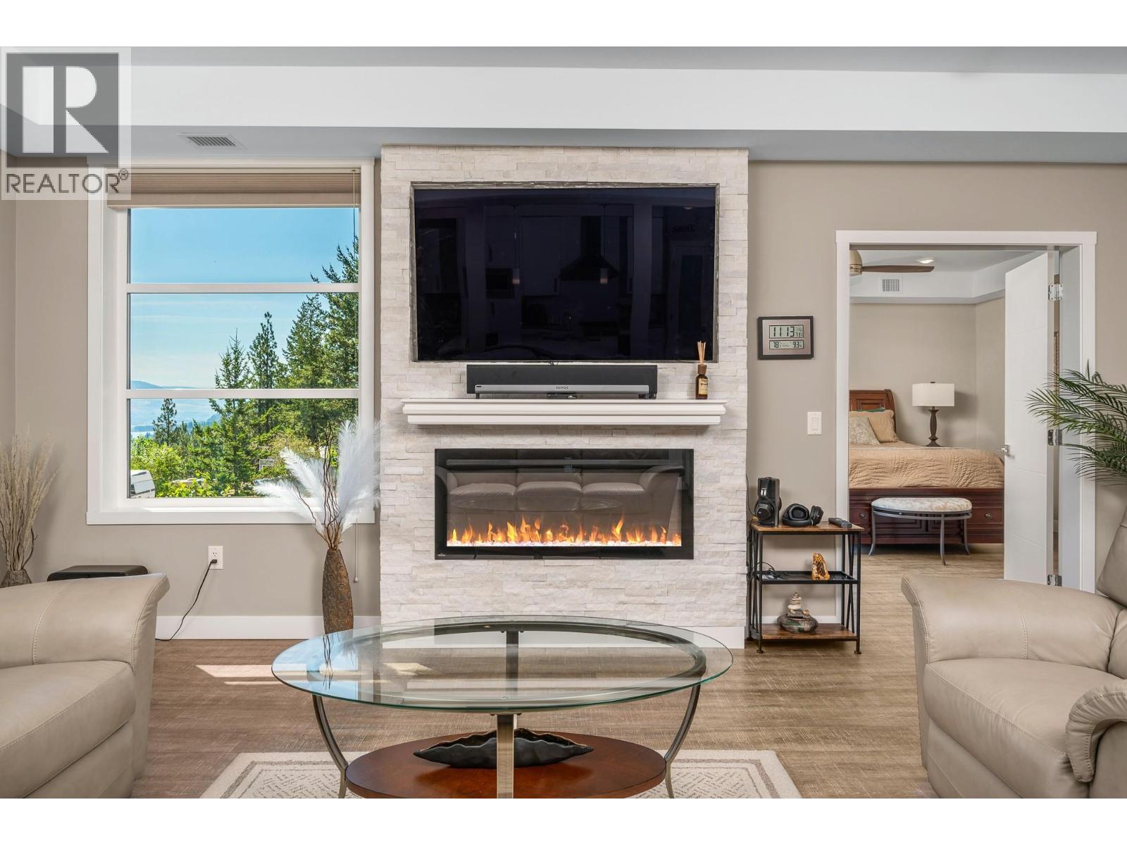 This exceptional modern townhome is thoughtfully designed with high-end finishes and premium features throughout. The chef-inspired kitchen boasts a full suite of KitchenAid appliances, including a French door refrigerator, a gas cooktop with an electric oven, a built-in microwave, a dishwasher, and a convenient beverage fridge. Enjoy year-round comfort with energy-efficient Navien on-demand hot water, boiler heating, and a dedicated A/C unit for cooling. The elegant white stone electric fireplace adds warmth and style to the living area. The primary suite offers a spa-like en-suite with a skylight and soft under-cabinet lighting. Outdoor living is unmatched with three spacious decks: an east-facing deck with peek-a-boo views of Kalamalka Lake perfect for morning coffee, a large south-facing deck with glimpses of Wood Lake—plumbed and ready for a hot tub—and a third deck off the entry for added outdoor space. Additional highlights include a rough-in for a central vac, two oversized garage stalls with built-in storage, and access to a beautifully landscaped common garden area. Ideally located near Kelowna International Airport, Lake Country amenities, scenic walking and biking trails, and just one kilometre from a brand-new RV storage facility. This home offers a rare combination of luxury, functionality, and convenience in one of the Okanagan’s most desirable communities. (id:58842)