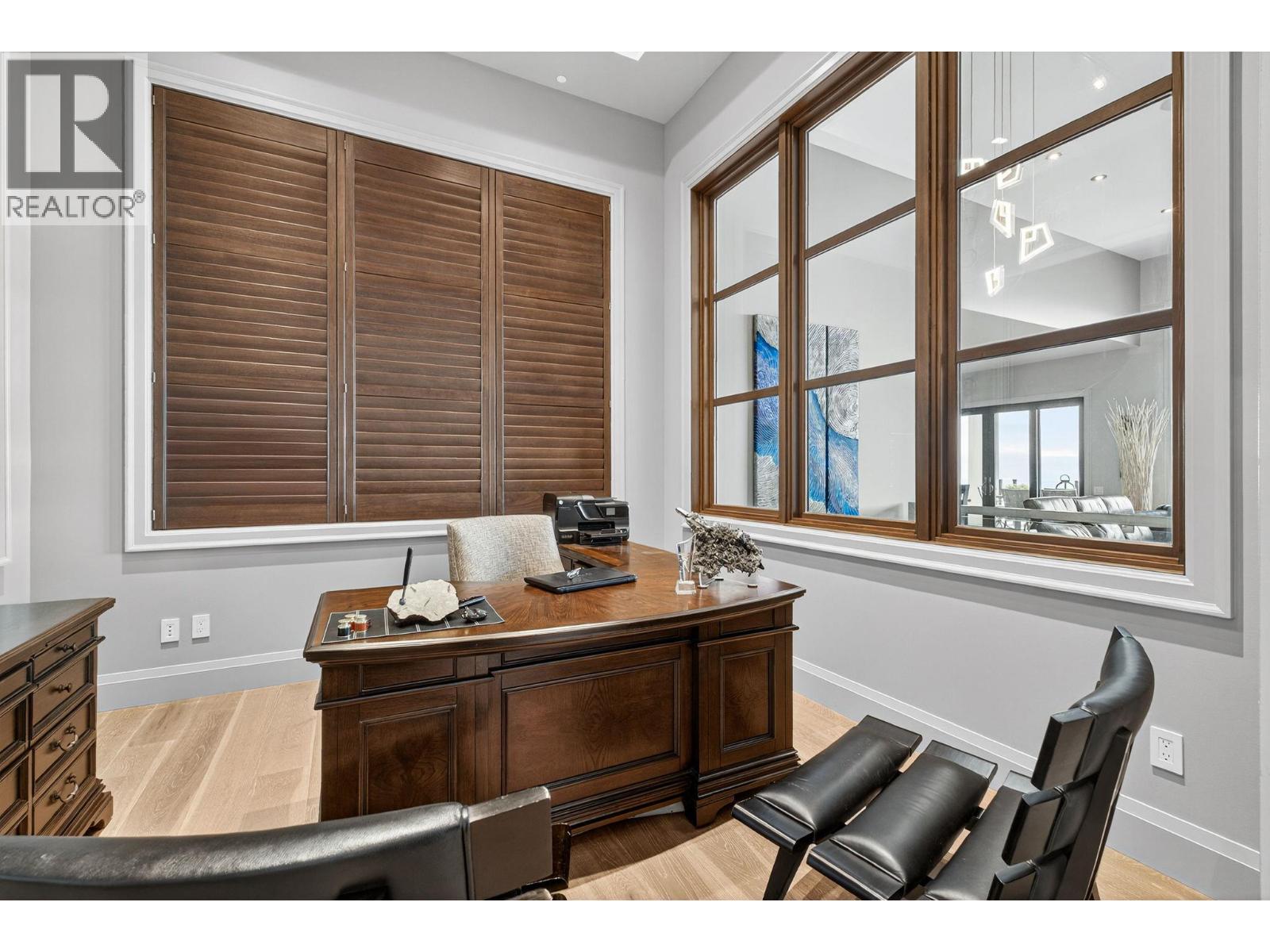 Welcome to an unparalleled luxury residence where custom design meets timeless elegance. This 5,172 sq ft architectural gem is a testament to superior craftsmanship, offering captivating lake, vineyard, and mountain views—a backdrop as exquisite as the home itself. Step inside to discover an expansive primary bedroom, highlighting a luxurious ensuite with steam shower, soaker tub, heated floors and interim lighting. The walk-in closet, complete with its own washer and dryer, adds convenience to luxury living. The modern kitchen boasts top-of-the-line appliances, an instant hot water tap, and a large quartz island, complete with a prep sink—perfect for gatherings with family and friends. A welcome addition is a Butler’s pantry complete with fridge and stove. Adjacent to the dining room, there’s a beverage centre with wine fridge, sink, and built-in shelving/storage with elegant sliding wood doors. Throughout the home, you’ll find soaring ceilings, wide plank flooring, modern lighting along with stainless steel/glass railings. The executive office can overlook the garage if need be, catering to car enthusiasts. It highlights a triple car garage with an epoxy floor, but for discretion and practicality the windows have customized wooden louvered blinds. The walk-out basement features three additional bedrooms, including a Jack and Jill bathroom—ideal for teenagers seeking their own space. Unwind in the saltwater heated pool or relax on the large deck and patio, overlooking a maintenance-free, fully fenced yard. This immaculate home features a backup generator, electric blinds, built-in audio system, kids’ play loft, theatre room, a second laundry room in the basement, and newly sealed driveway, deck and patio. Plus Rubroc accent added around the pool deck, an artificial front lawn, and a “no-grass” backyard! This Lakeview Heights masterpiece truly looks and feels brand new—crafted for those who appreciate luxury, elegance, and flawless attention to detail. (id:58842)