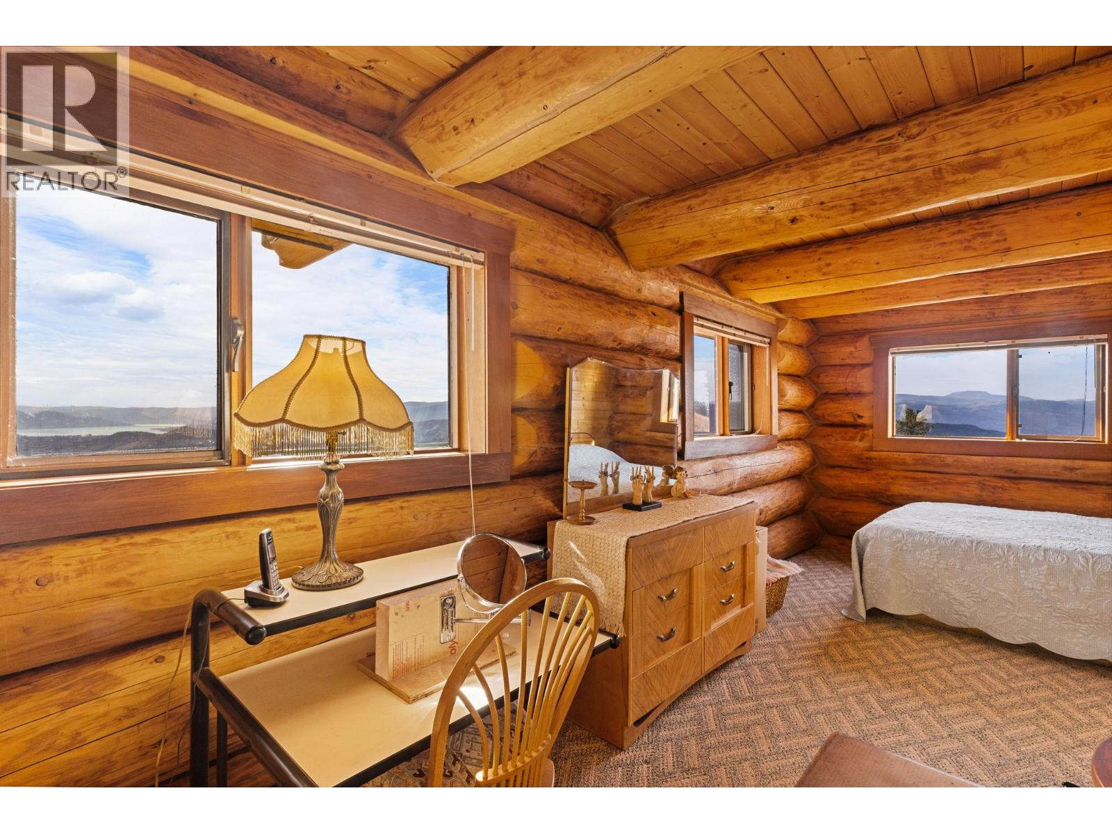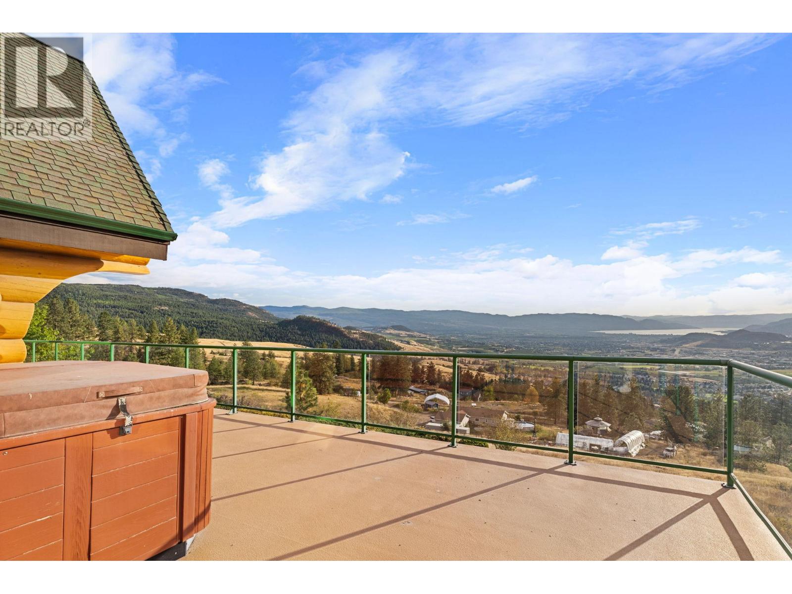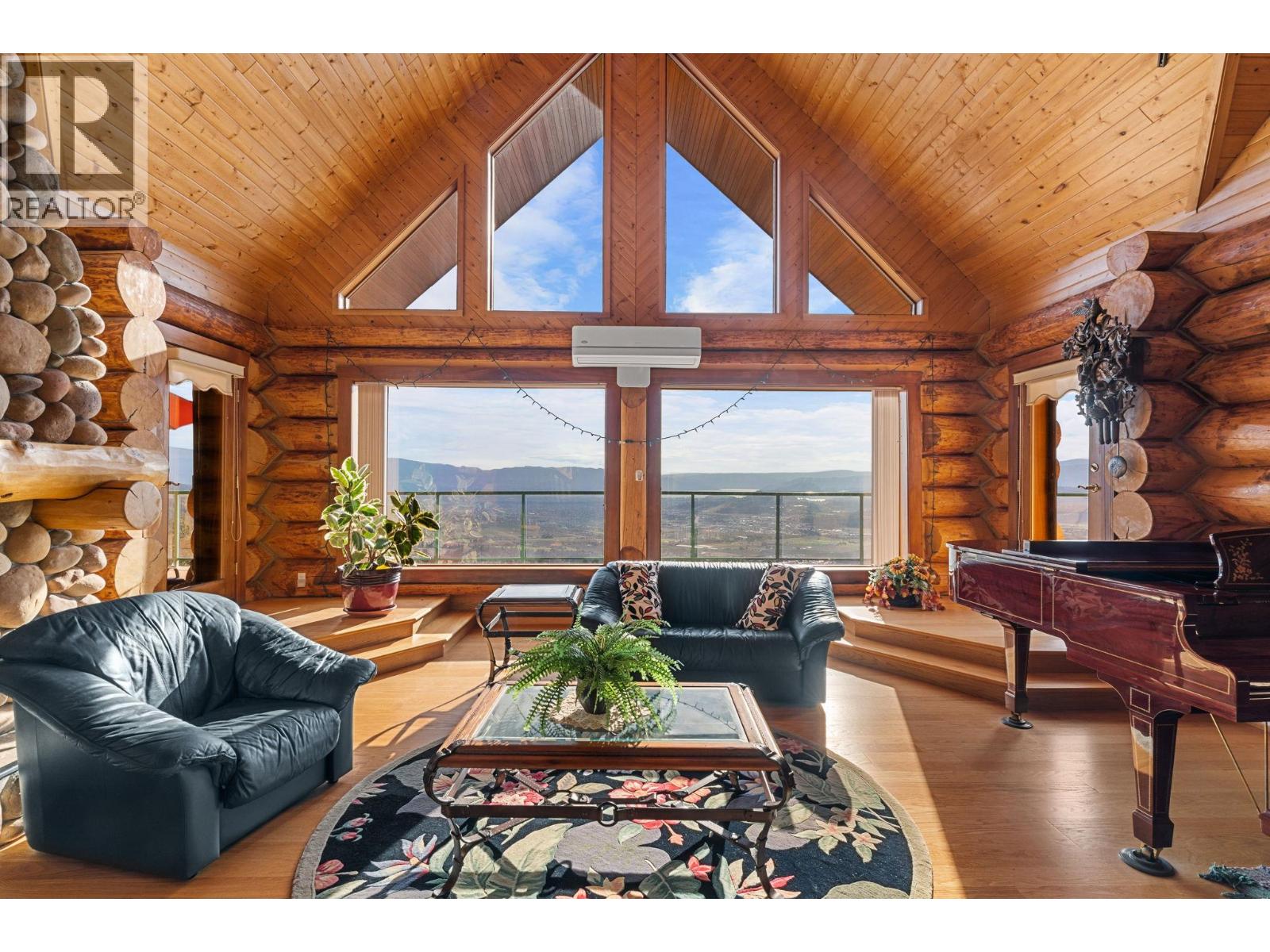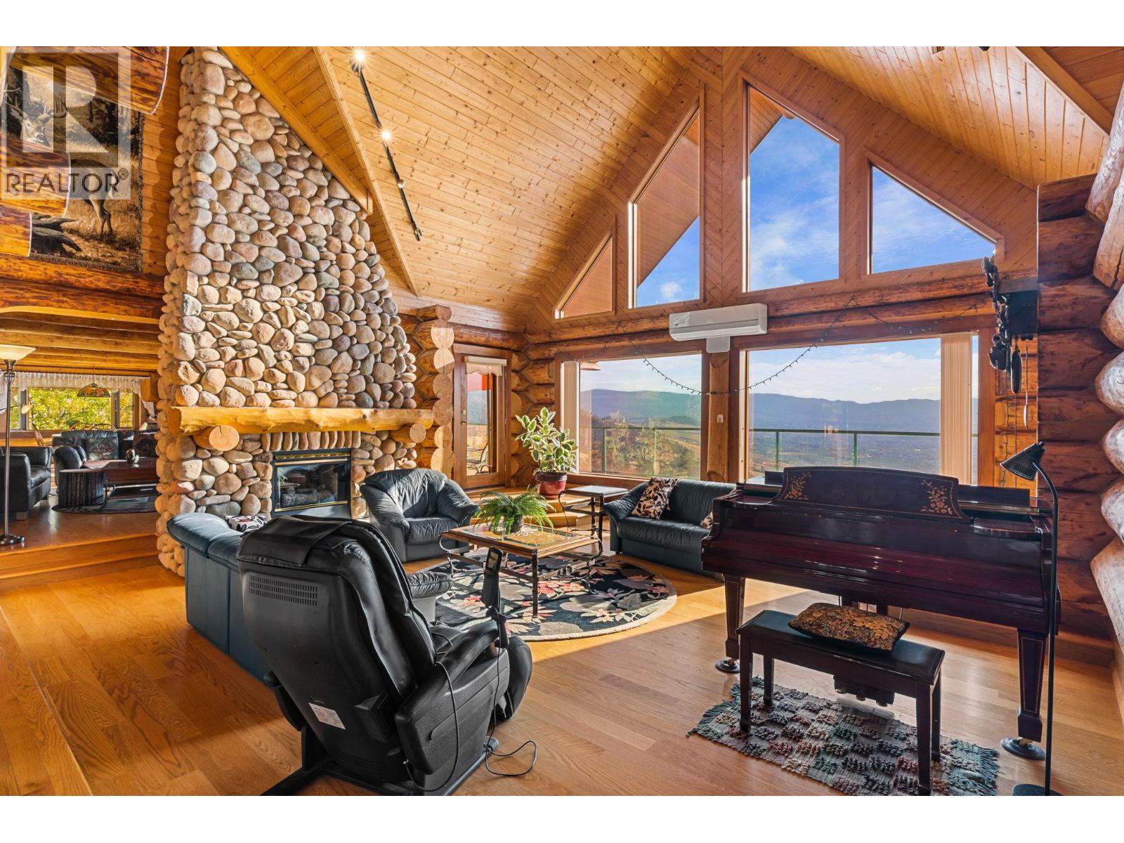 Perched high above Kelowna on a private 10-acre hillside, 4520 Farmers Drive is an immaculately maintained 5,000+ sq. ft. log home offering breathtaking panoramic views of the city lights, Okanagan Lake, the valley, and surrounding mountains. Built in 1996 and lovingly cared for, this impressive home blends classic log craftsmanship with modern comforts, including in-floor radiant heat complete with a brand new boiler system, ductless A/C, a stunning stone fireplace, and a chef-inspired kitchen with a gas cooktop and built-in oven. Soaring ceilings and walls of windows flood the living spaces with natural light while perfectly framing the incredible scenery. The main level features two spacious bedrooms, a full bathroom, and open living and family areas that flow seamlessly to a large deck with a hot tub, perfect for entertaining or relaxing while taking in the views. Upstairs, the private primary suite offers a true retreat with a 5-piece ensuite, walk-in closet, and a lofted office or workout area overlooking the landscape. The lower level includes a finished walk-out basement with recreation space, storage, a separate entrance, and a large 2-car garage with room for up to four vehicles. Set on over 10 acres of rolling hillside with a gated driveway and RV parking, this property offers exceptional privacy while still being just minutes from the airport, golf courses, and Kelowna’s amenities. A true Okanagan retreat where every sunrise and sunset feels like a private show. (id:58842)
