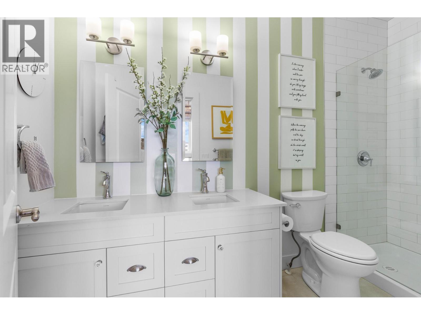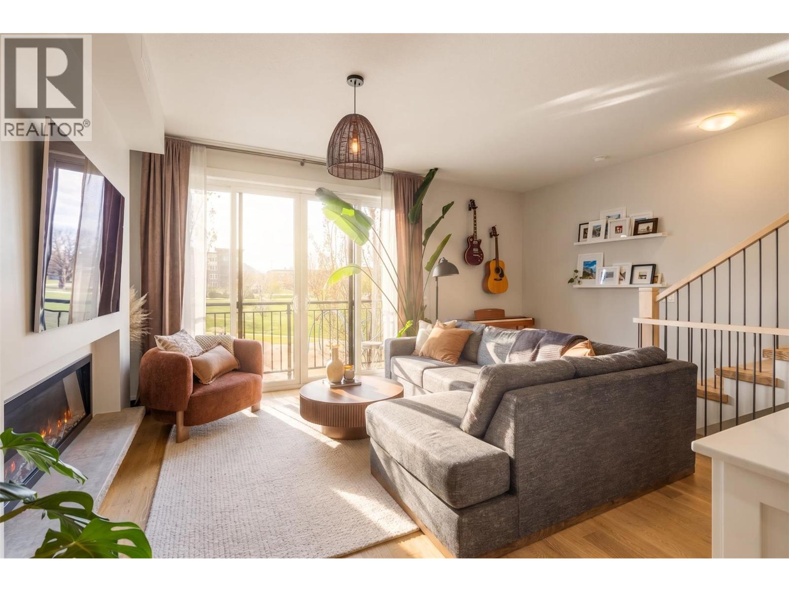 Welcome to Parkview at Central Green, where urban design meets modern comfort in this beautifully appointed townhome. Offering 3 bedrooms and 2.5 bathrooms, this home delivers both space and versatility for everyday living. Thoughtfully customized throughout, each room enhances the home’s chic aesthetic. The bright kitchen features a spacious quartz island with seating for four—perfect for casual dining or entertaining. The adjoining dining area is highlighted by a striking brick feature wall and a custom banquet bench, creating a warm and inviting gathering space. The living room is both bright and spacious, anchored by a decorative fireplace with a concrete hearth, adding a touch of contemporary character. Upstairs, the primary bedroom offers large picture windows, a walk-in closet, and a well refined ensuite with double vanity and a generous shower. A double-car garage provides added convenience and ample storage. Ideally located between Downtown Kelowna and the hospital, this home offers easy access to all amenities. Enjoy nearby transit, parks, and beaches while embracing a truly walkable lifestyle. Don’t miss this opportunity to own a centrally located urban gem. Pet-friendly—allowing up to 2 cats or 2 dogs. Explore the virtual tour link for a 3D walkthrough, full photo gallery, and floor plans. https://unbranded.youriguide.com/106_555_buckland_ave_kelowna_bc/ (id:58842)