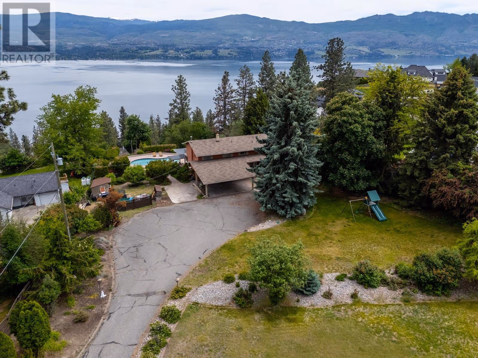 Rare Find! Lakeview home on .81 Acres in the heart of West Kelowna. Nestled among vineyards and steps from award-winning wineries, this spacious 4-bed home offers stunning Okanagan Lake views and privacy—just minutes from the Westside Wine Trail. The main level features a living room, family room, dining area, and kitchen with stainless steel appliances and a 6-burner gas range. Enjoy stunning lake views from every main-level room, along with access to a lake view patio off the family room and a wrap-around porch off the living room. Upstairs, you'll find four spacious bedrooms, including a lake view primary suite with an ensuite bath, bonus area and laundry. A large second-story patio runs the full length of the home, offering panoramic views of the lake and surrounding mountains. The basement adds a rec room, living area, and ample storage. Outside, the backyard is a showstopper with stamped concrete and paver pathways, a heated saltwater pool, and a covered patio with radiant overhead heating—ideal for enjoying warm Okanagan summers. Additional features include a carport with room for multiple vehicles and extra parking for RVs, boats, or recreational toys. Walking distance to the lake and Kalamoir Park. Only 10 minutes to downtown Kelowna—the first highway exit gives bridge access with no traffic lights. The lot is part of a proposed subdivision, creating a lot between the road and the house. The seller will cover subdivision costs. (id:58842)