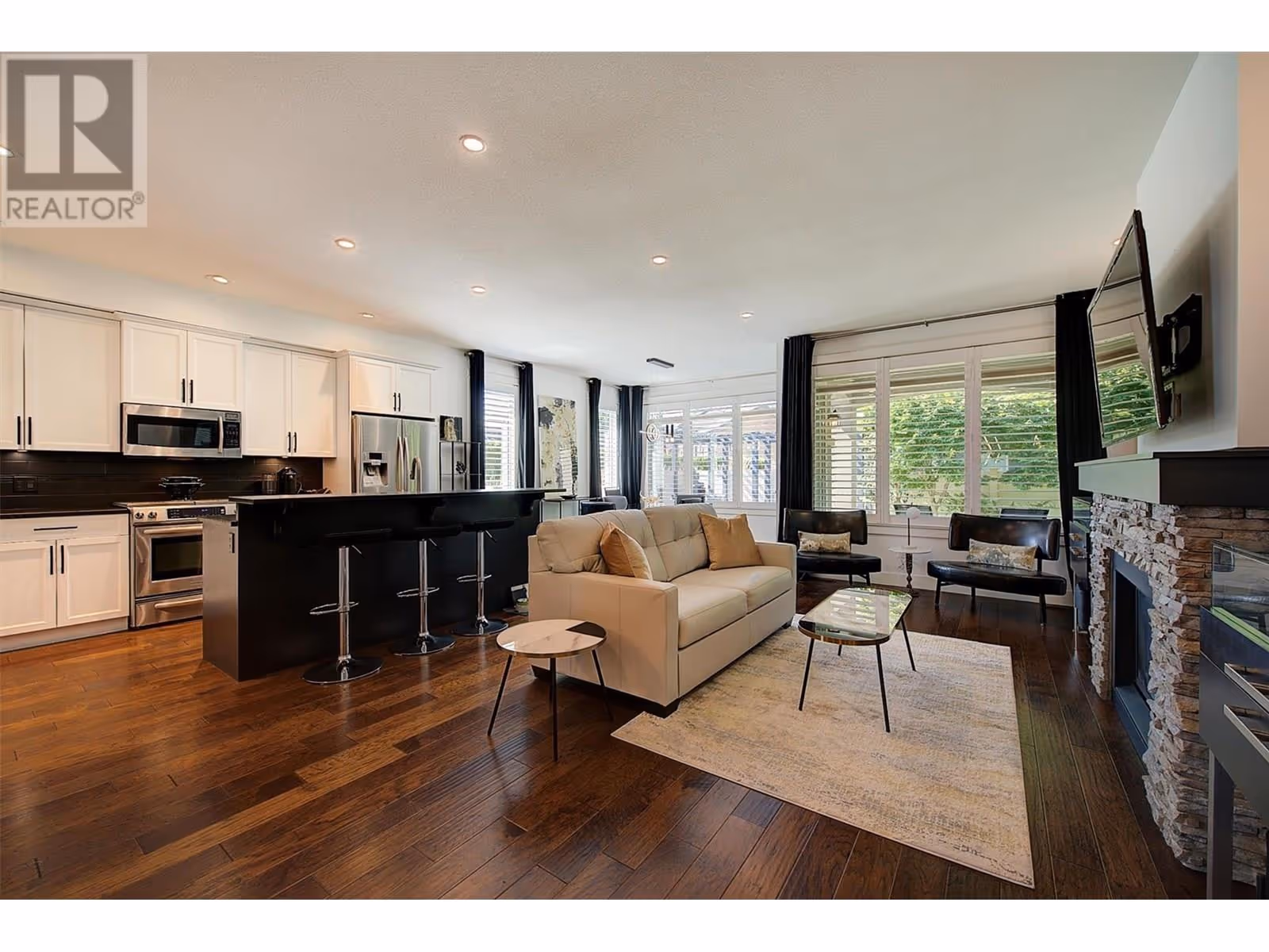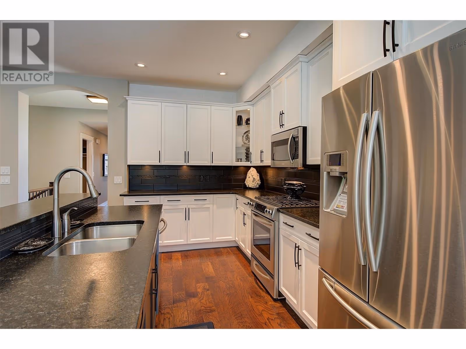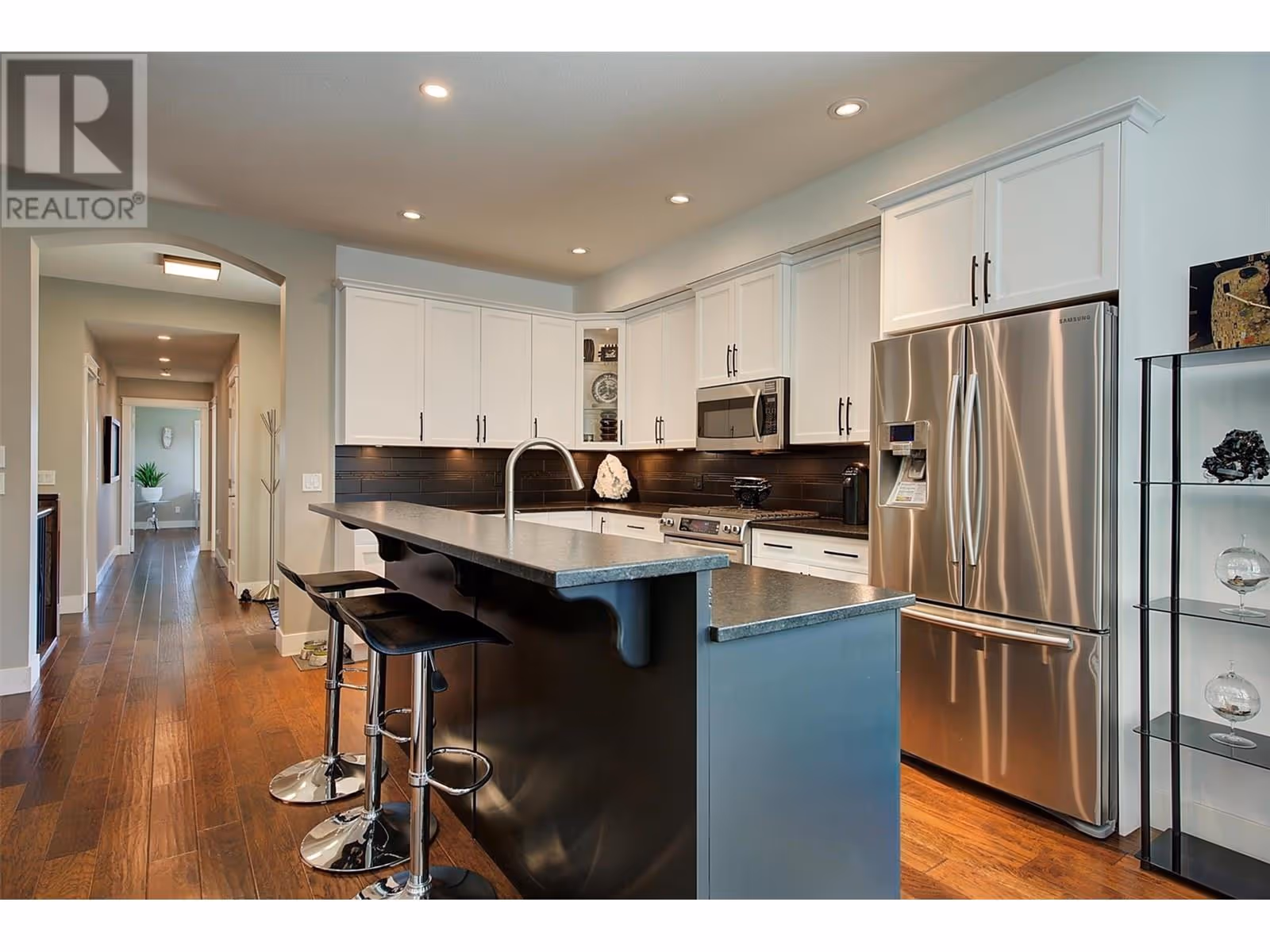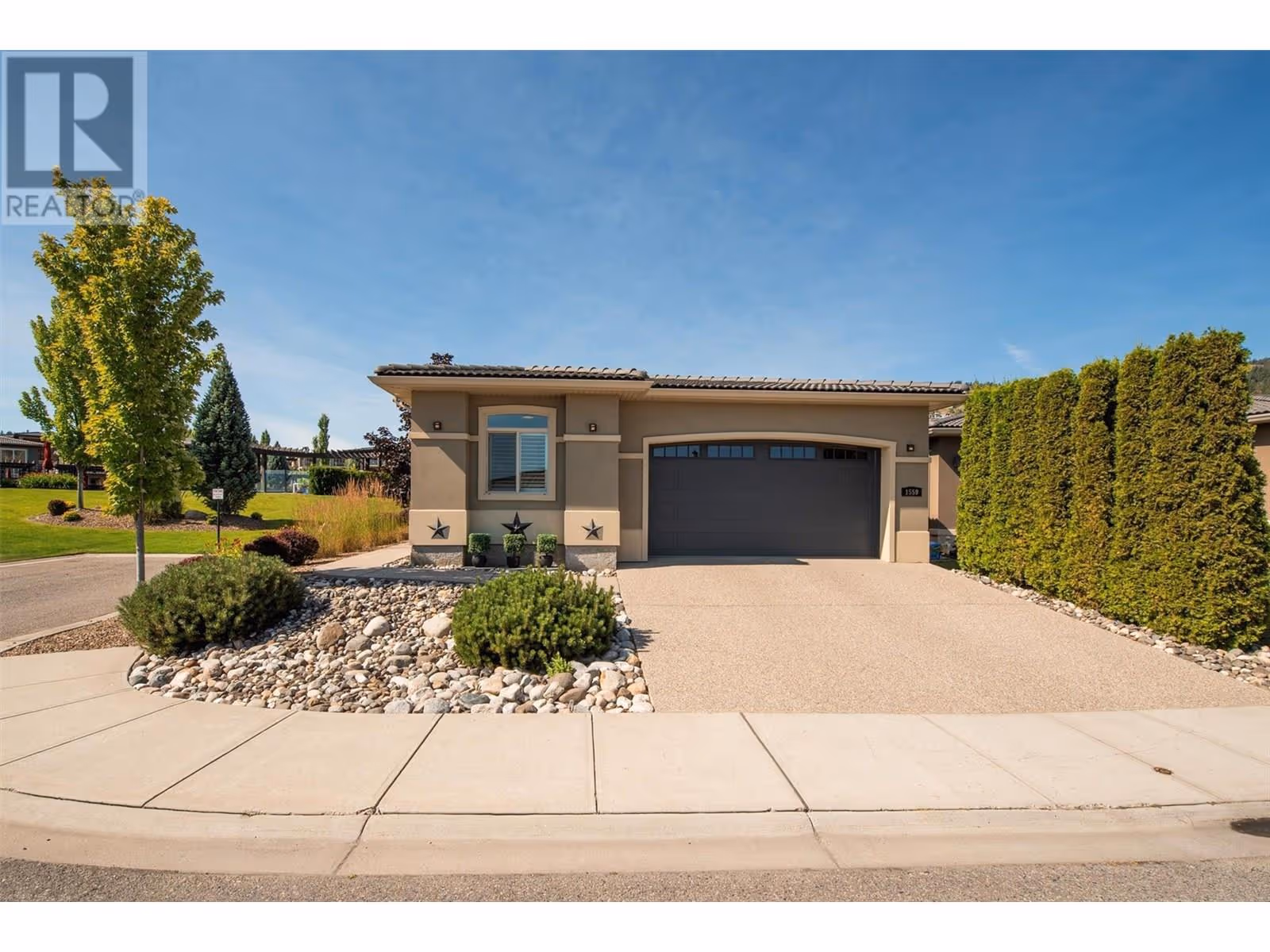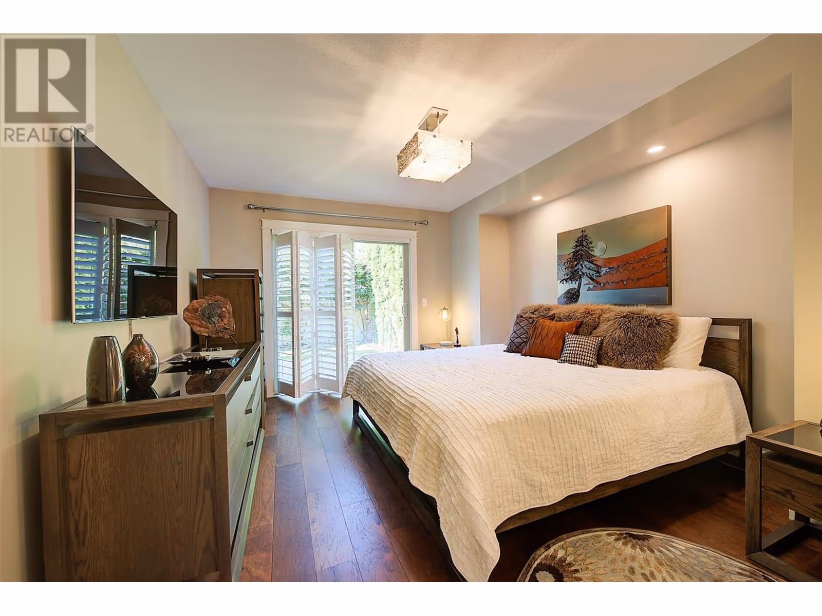 Don’t Miss the Boat… Literally! West Harbour — the ultimate in resort-style waterfront living in one of the Okanagan’s most coveted gated communities. This bright, modern home is ideally located beside the pool and hot tub for spontaneous dips, with a landscaped berm offering privacy. Just a 2-minute stroll to 500 feet of PRIVATE SANDY BEACH and your own 26' boat slip — BYOB: Bring Your Own Boat! Just open your backdoor to a true grade-level walkout (with no stairs to climb). This backyard oasis is fully fenced and surrounded by mature trees. Inside, this detached home features an elegant white kitchen with 42” uppers, a bold black island with honed granite, hardwood and tile flooring throughout. The open-concept functional layout offers a spacious living area bathed in natural light and windows with California shutters. The main level includes a generous primary bedroom with 5 piece ensuite and private access to the fenced yard. The second main level bedroom offset from the main living area with convenient access to an additional full bathroom. The finished lower level has two more bedrooms, a full bath, massive family room, and rare abundant storage. A double garage plus extra-long driveway fits oversized vehicles with ease. Enjoy unmatched amenities: beach, marina, clubhouse, gym, pickleball/tennis courts, pool, hot tub, and more — all for just $245/month. This is lakefront living at its best — stylish, spacious, and steps from Okanagan Lake. (id:58842)