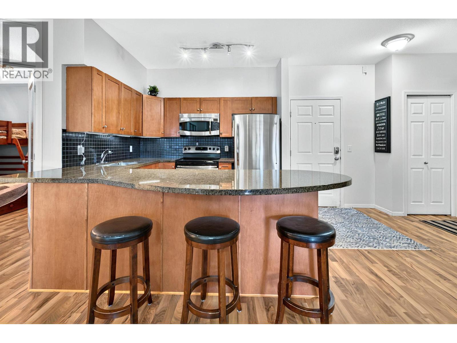 PRICED TO SELL! SELLER WILL PAY 1 YEAR OF STRATA FEES. Bright and spacious 2-bedroom + den, 2-bath condo with peaceful mountain and golf course views—just a 2-minute walk to 36 holes of championship golf and 20 minute walk to the UBCO. The open layout features a large kitchen with bar seating, a comfortable living and dining area, and a generous covered deck. The king-sized primary bedroom offers a private ensuite, while the den and second bedroom provide great flexibility. Highly desirable for both investors and owner-occupiers—popular with students for 8-month or full-year rentals. Amenities include an outdoor pool, hot tub, gym, bike storage, secure underground parking, and ample street parking. Bus stop at the front door and minutes to groceries, restaurants, and the airport. Pet-friendly (with restrictions), move-in ready, new washer/dryer, and most furnishings can be included. (id:58842)