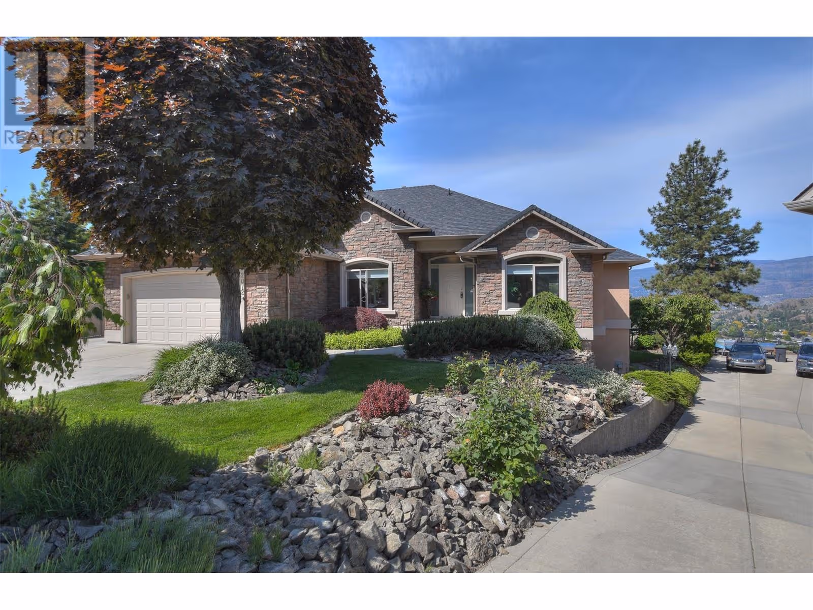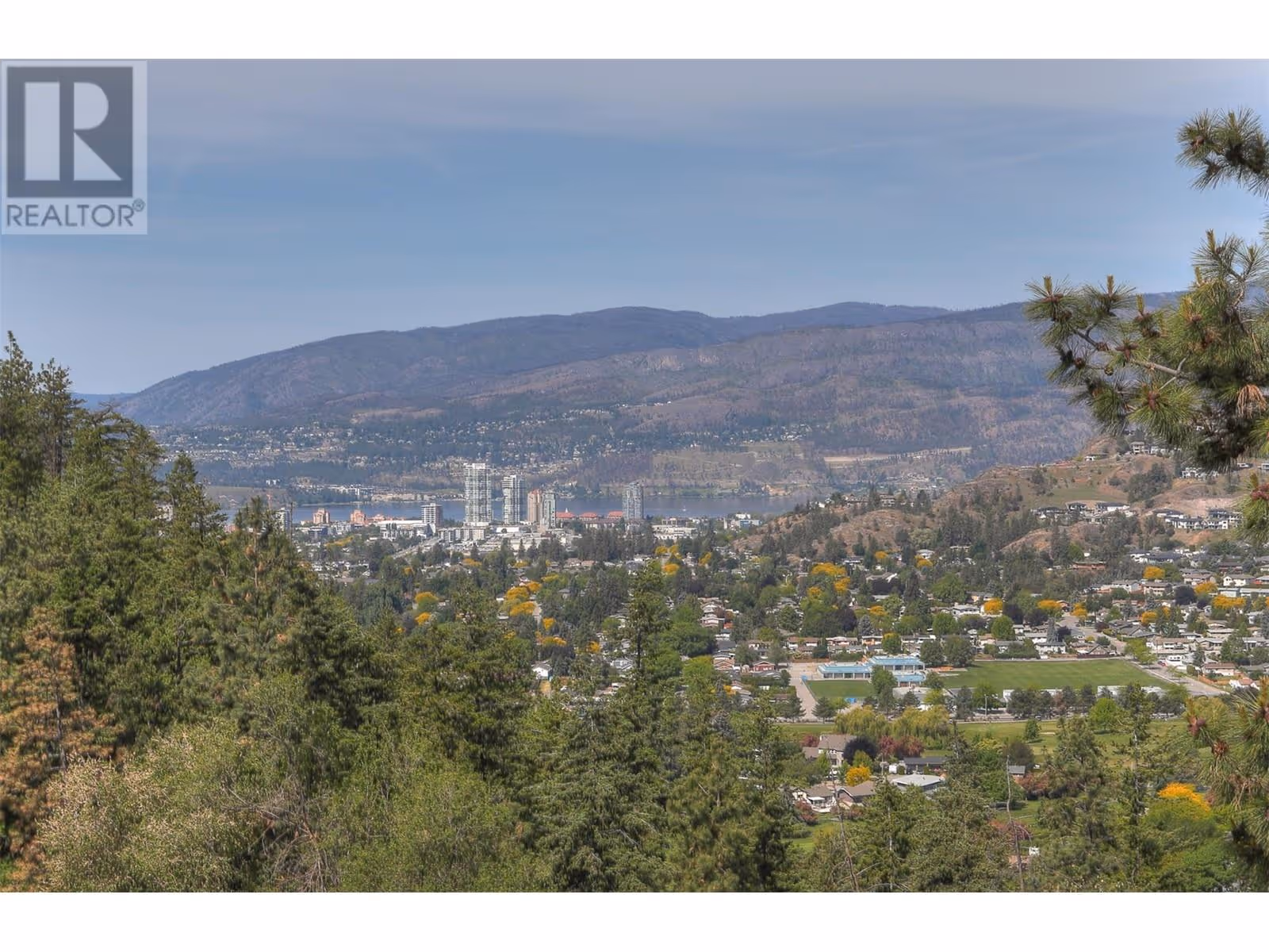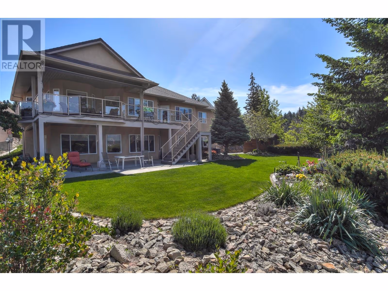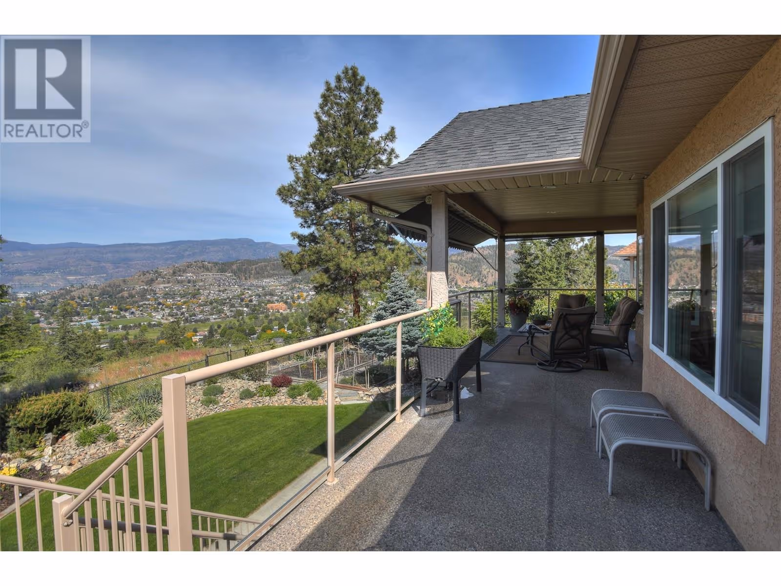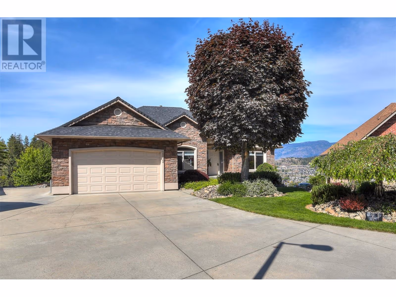 Truly a rare find on this small coveted private cul de sac on Dilworth Mountain. Only the second time on the market. You have the opportunity to enjoy the evening sunsets, twinkling lights in the valley and orchards below, along with colored hues of the sky reflected on Lake Okanagan with your loved ones from the balcony. This meticulously kept 4100 square foot rancher has been beautifully upgraded from roof, insulation, mechanical, Poly B plumbing, flooring, hardwood, carpet, kitchen cabinetry , island, countertops, appliances, 2 fireplaces, bathrooms, butlers pantry, blinds, windows, too numerous to mention. Primary and 1 bedroom, 2 bathrooms and office on the main floor. Access to upper deck from Kitchen and primary bedroom with covered deck and gas BBq Hookup. The lower level is easy to suite, has 3 bedrooms, bathroom, storage and oversized family room. The exterior is a sight to behold, professional landscaping around the entire yard, 7 irrigation zones, with a triple driveway, one extending toward the back with an engineered parking pad. Multi car parking with no jockeying required. Please call your agent for a private viewing and spec list. of this amazing home. (id:58842)