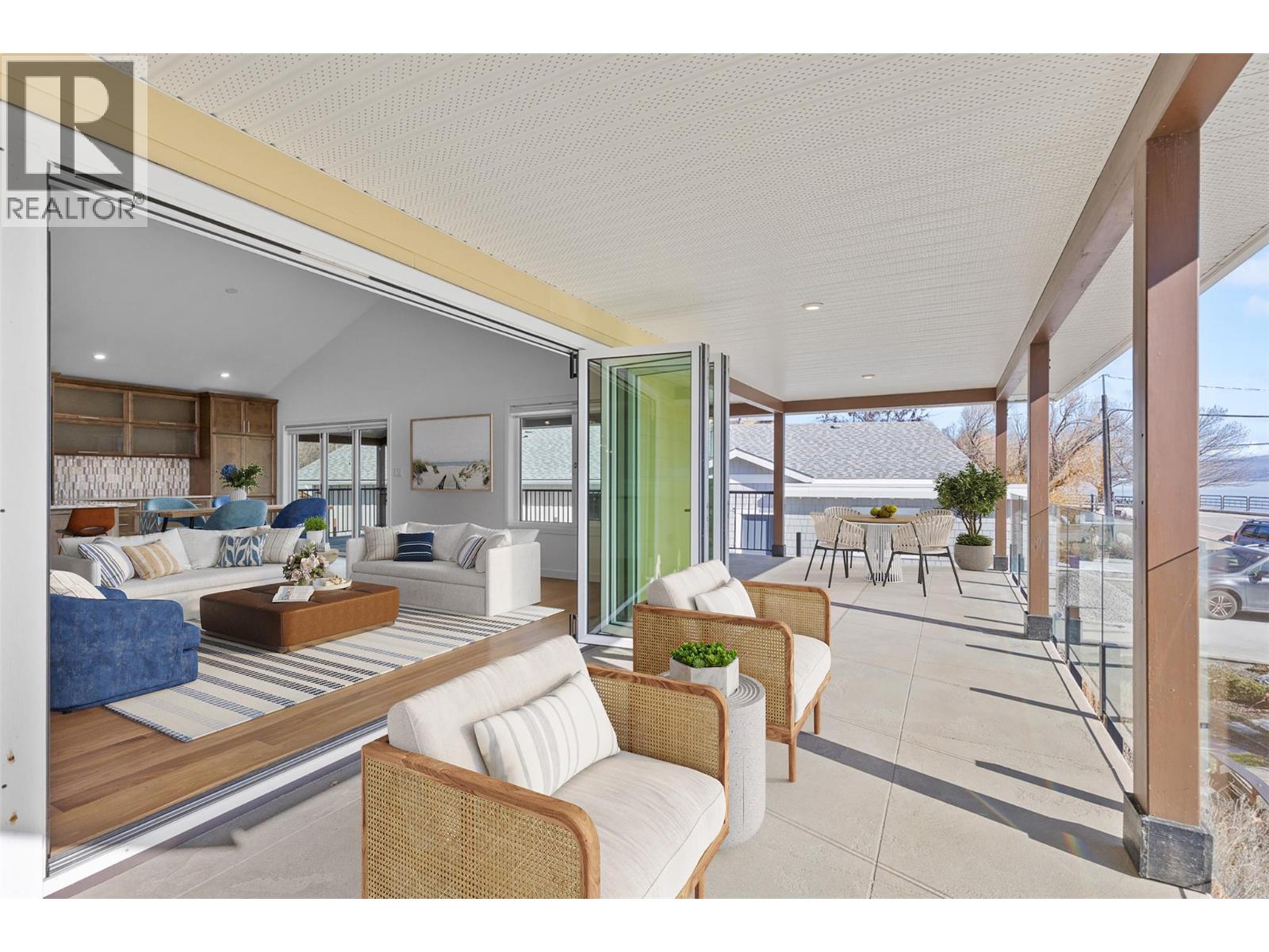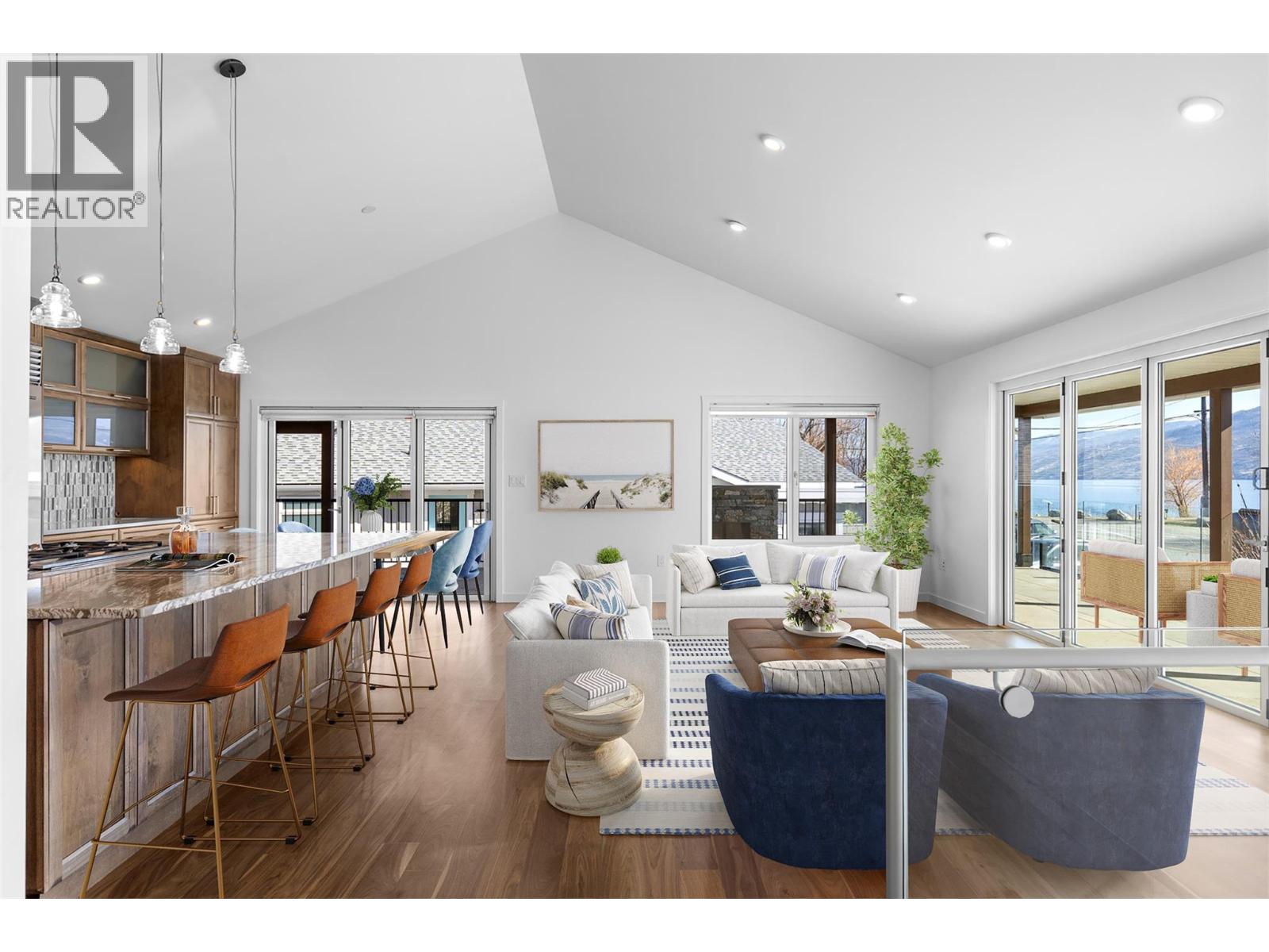 Rare semi-waterfront opportunity on prestigious Beach Avenue, directly across from Okanagan Lake, offering exceptional lake views and the ultimate Okanagan lifestyle. This thoughtfully designed residence captures stunning lake views and offers open-plan living with seamless indoor-outdoor living through multiple expansive glass bi-folding doors that open onto a covered deck with gas fireplace, stamped concrete, and glass railings. The custom kitchen features Miele appliances, Sub-Zero fridge, gas cooktop on a large quartz island, and vaulted ceilings above recently refinished walnut hardwood floors throughout the main living area. The primary retreat offers folding glass doors to a private lakeview deck, walk-in closet, and dream ensuite with custom concrete-finished shower. The bright lower level features a huge family room, two additional bedrooms (one with walk-in closet), full laundry, abundant windows, and space to create a fourth bedroom plus an office or gym. Above the oversized heated 29x29 double garage sits a 900 sq/ft legal one-bedroom suite with high ceilings, private laundry, folding glass doors to its own deck, and incredible lake views—ideal for guests, family, or rental income. Flat lot with flat driveway parking for up to eight vehicles and low-maintenance zeroscape landscaping. A rare Beach Avenue offering with lake views, a legal suite, and exceptional parking—delivering the complete Okanagan lifestyle just steps from the lake. (id:58842)