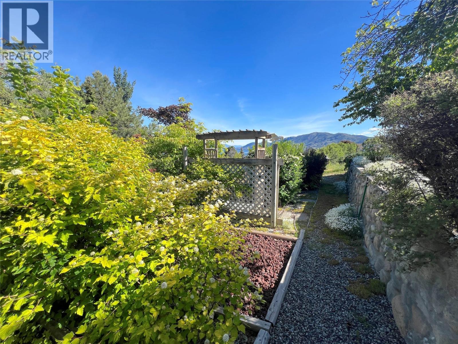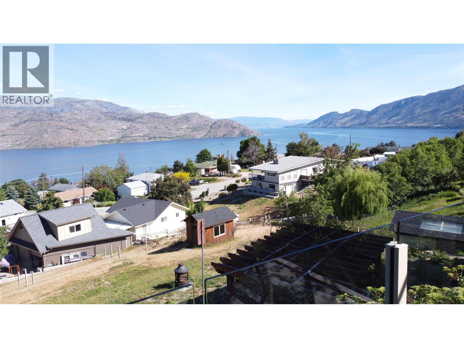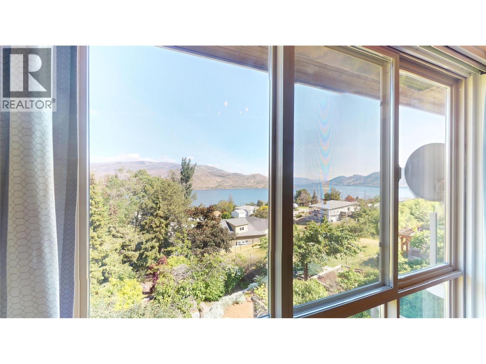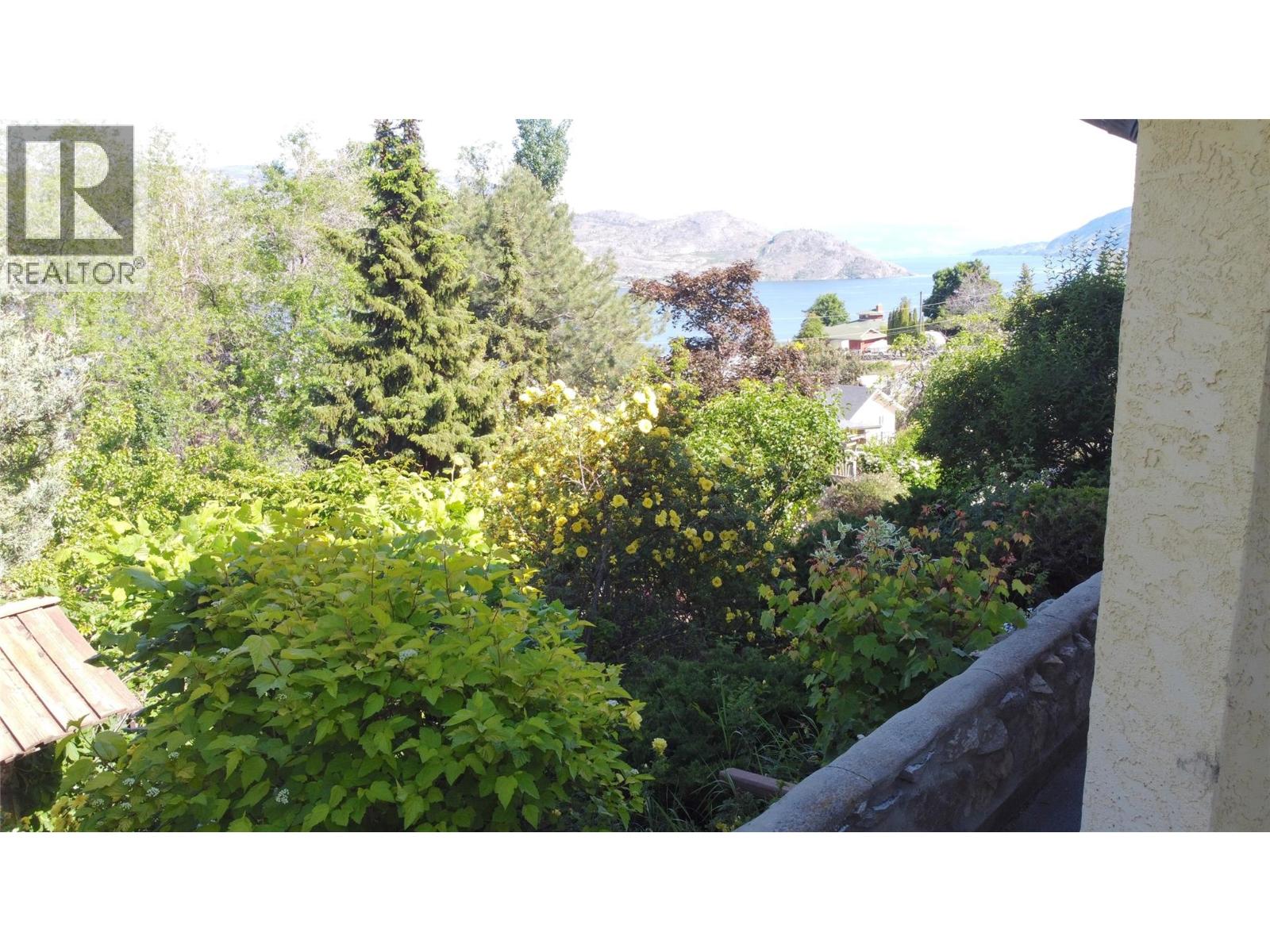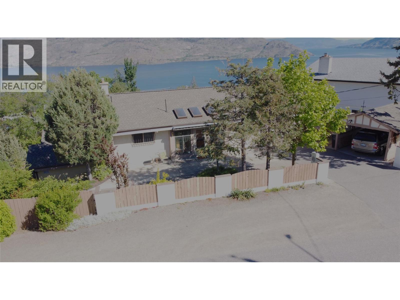 Great lake views looking south towards Penticton. No step rancher walk out with vaulted ceilings, beams and archways & stained glass accents. Well cared for home with pride of ownership and updates over the years, recently new hotwater tank and new air conditioning. There is a private lower side yard gathering area plus the backyard is fully terraced and landscaped with fruit trees and gardens. Closed in court yard at the front of the house for privacy and parking for RV or boat. Parking out front along the road as well. Great neighbourhood on school bus route so plowed first in the winter. That rare combination of a flat driveway with lakeviews! (id:58842)