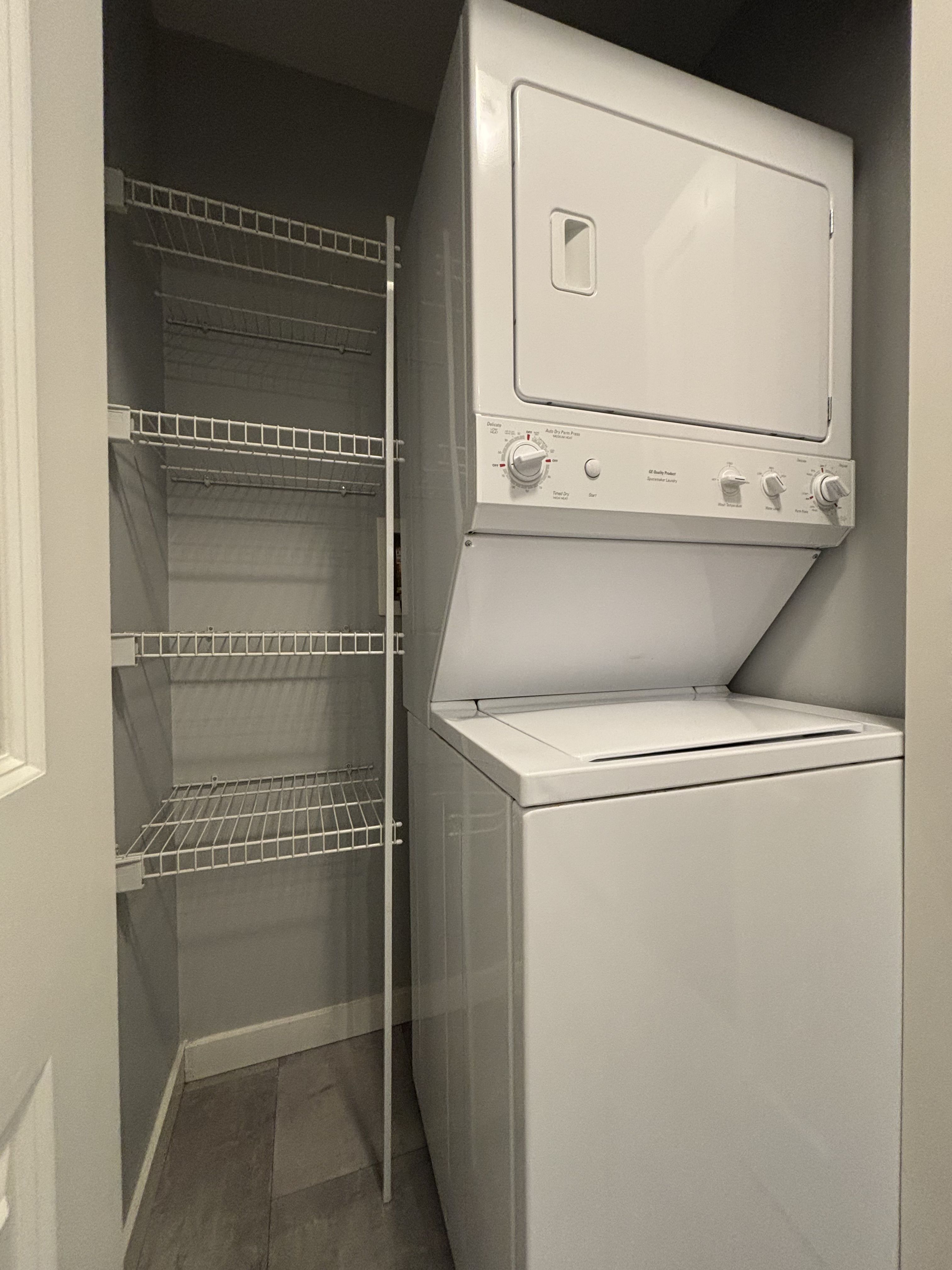 Tenants are responsible for utilities besides water. 1 underground parking stall and storage locker are also included. The unit comes with fridge, stove, dishwasher, washer and dryer. Building has pool, volleyball court and BBQ area. Close to shopping, schools and parks. Available now. No smoking and no pets.