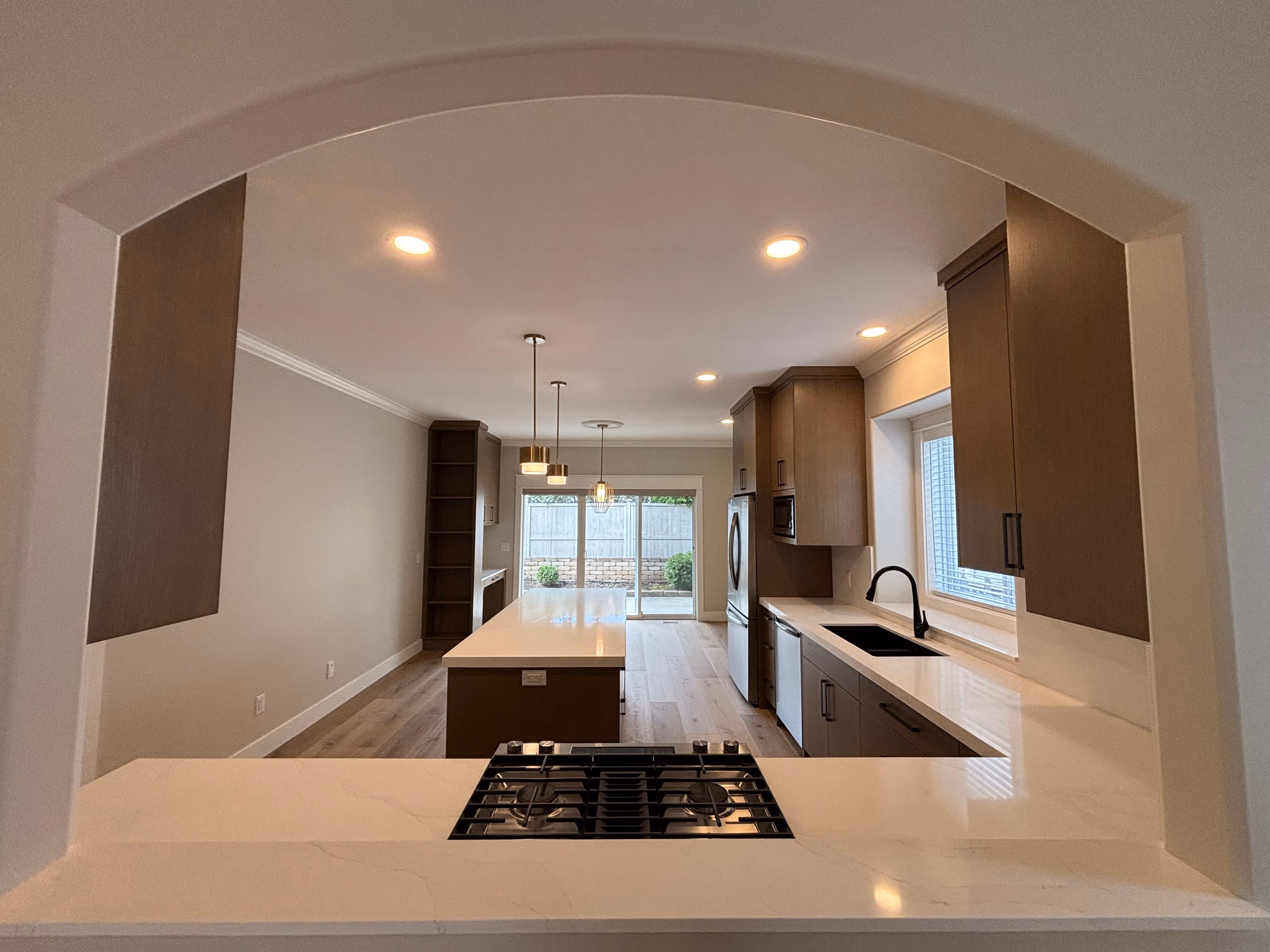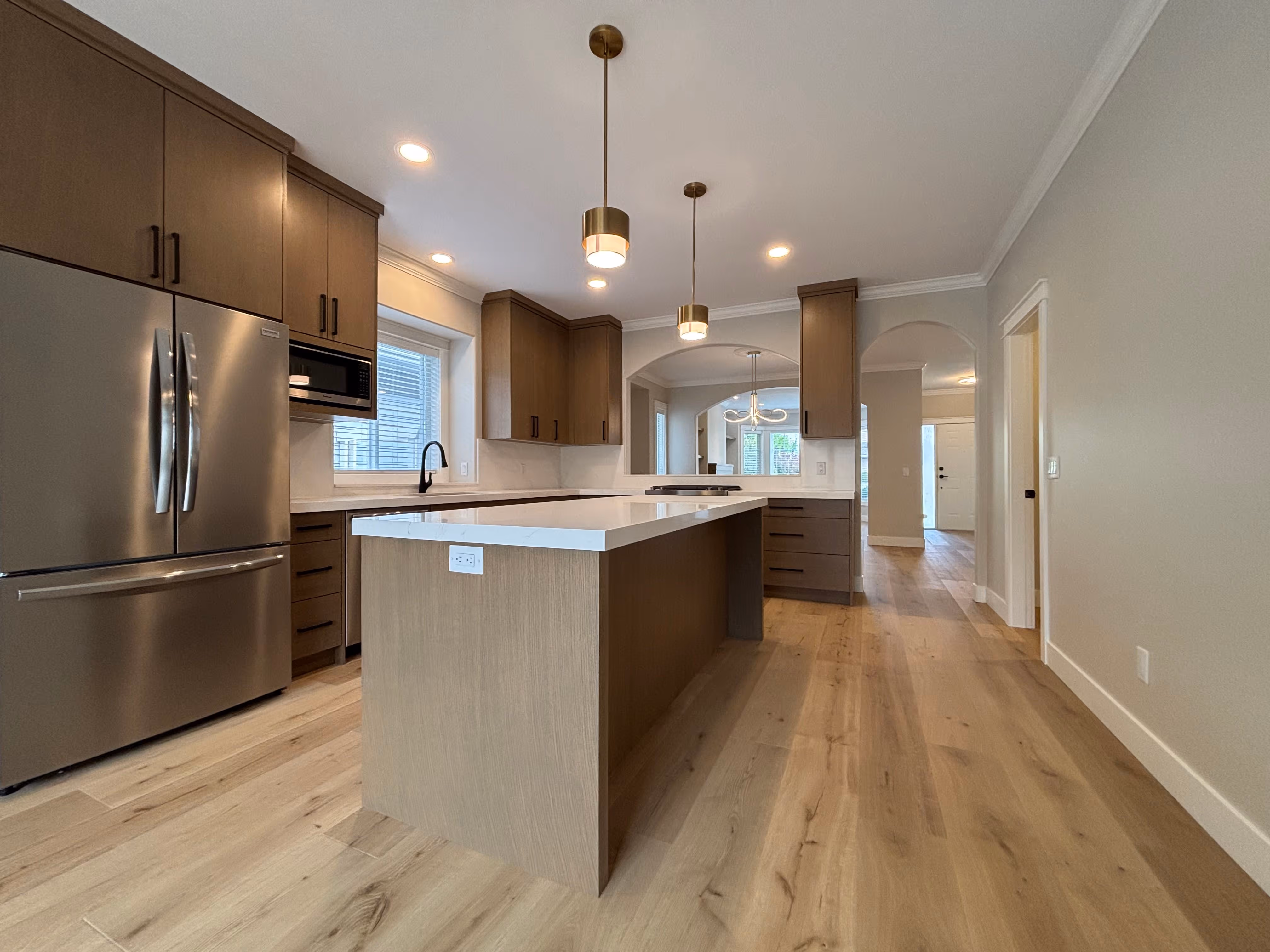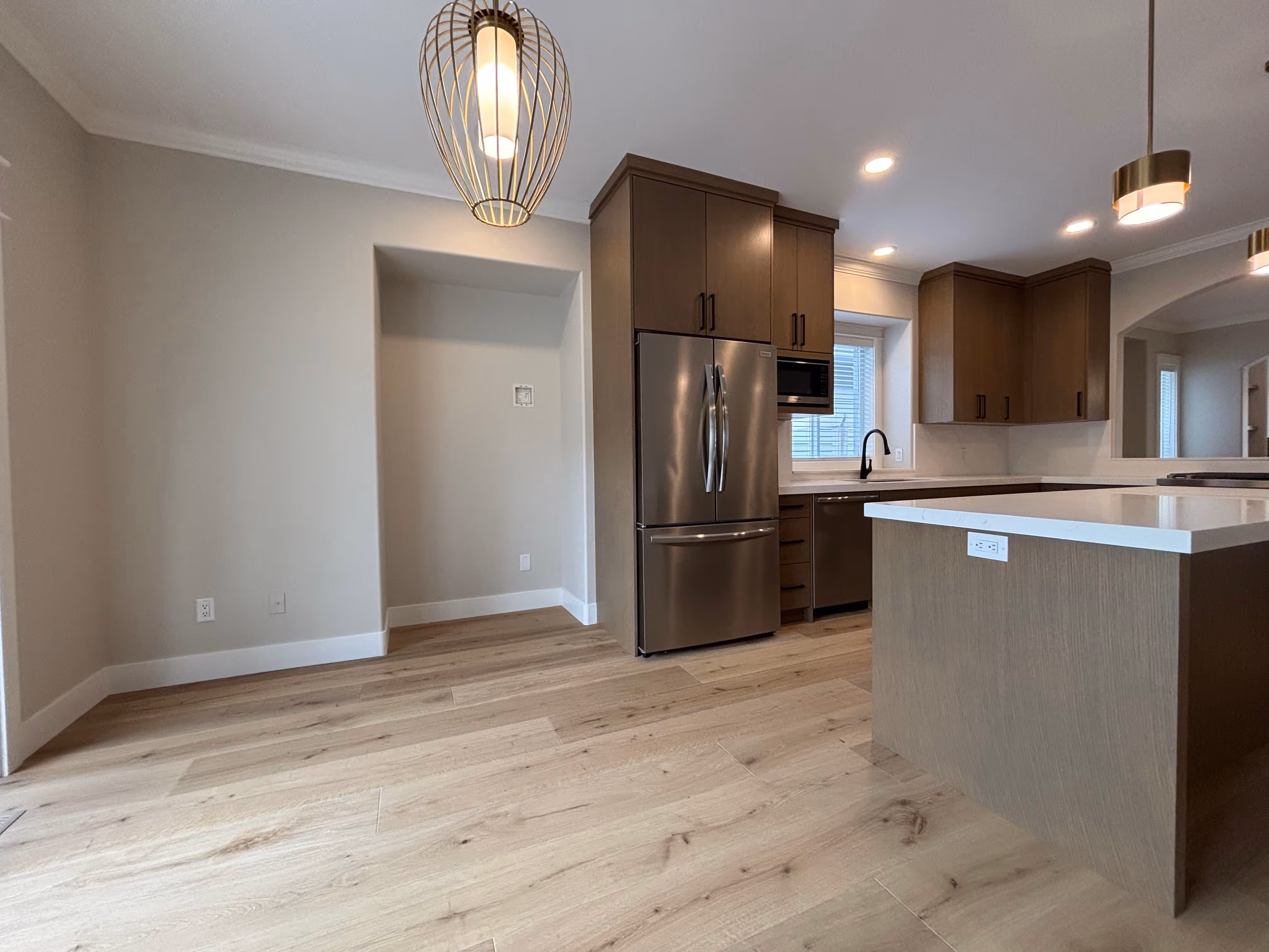 The kitchen comes with all appliances (fridge, gas stove, dishwasher and microwave). Large open island in the middle of the kitchen and a built-in office/desk space near the back patio doors.