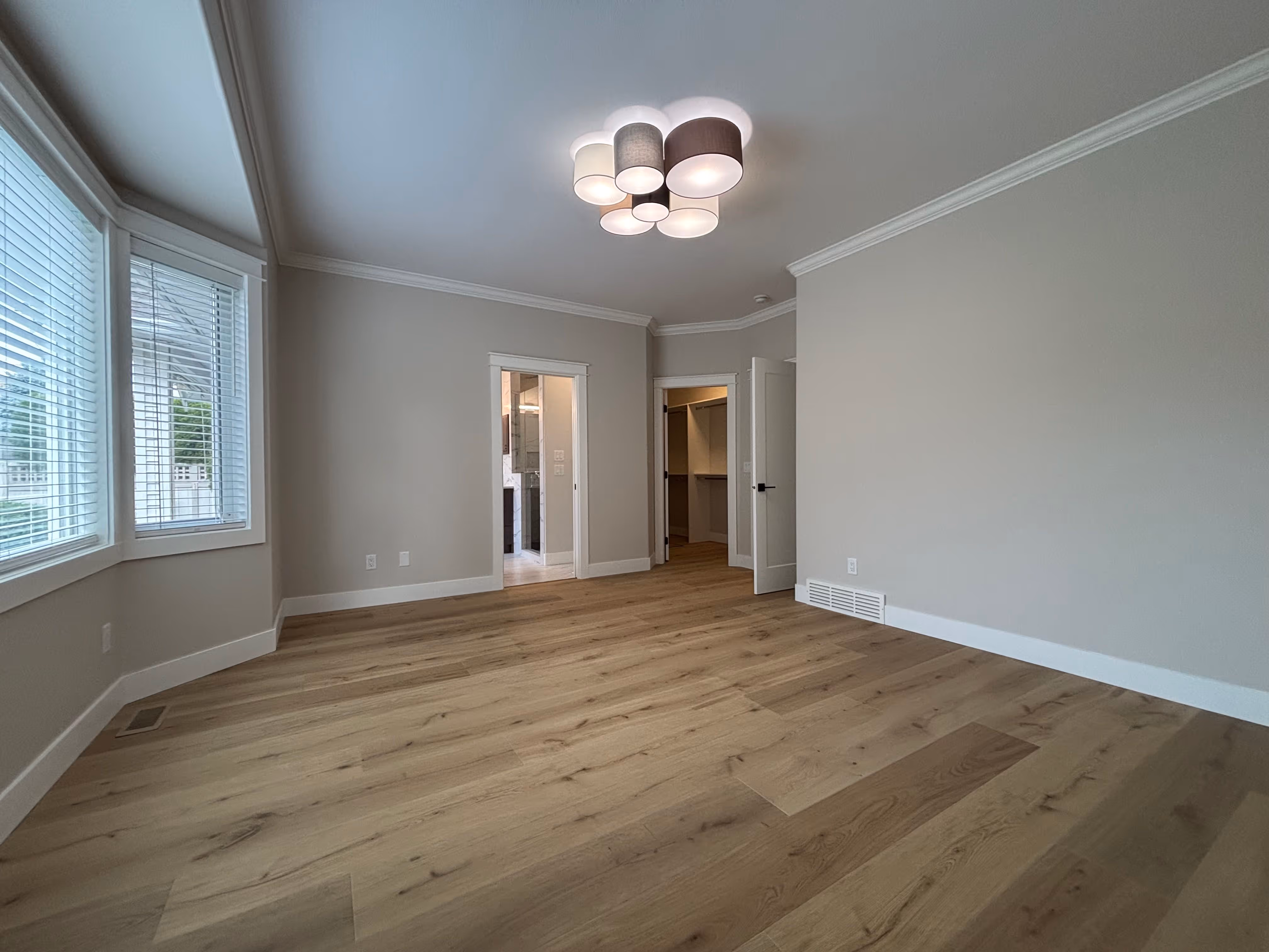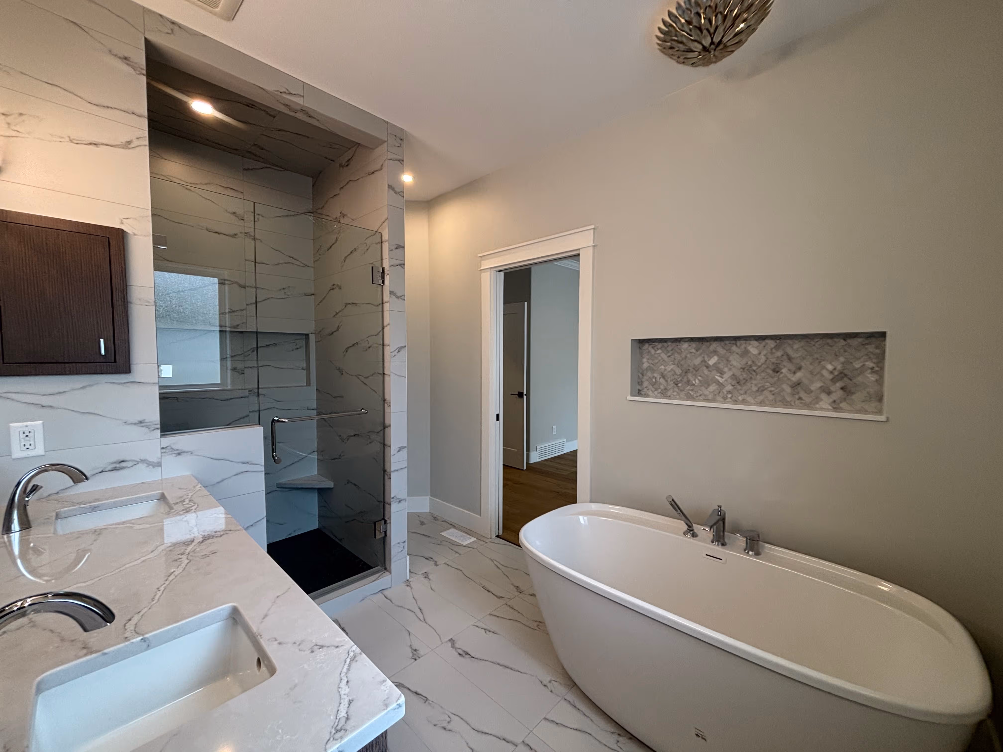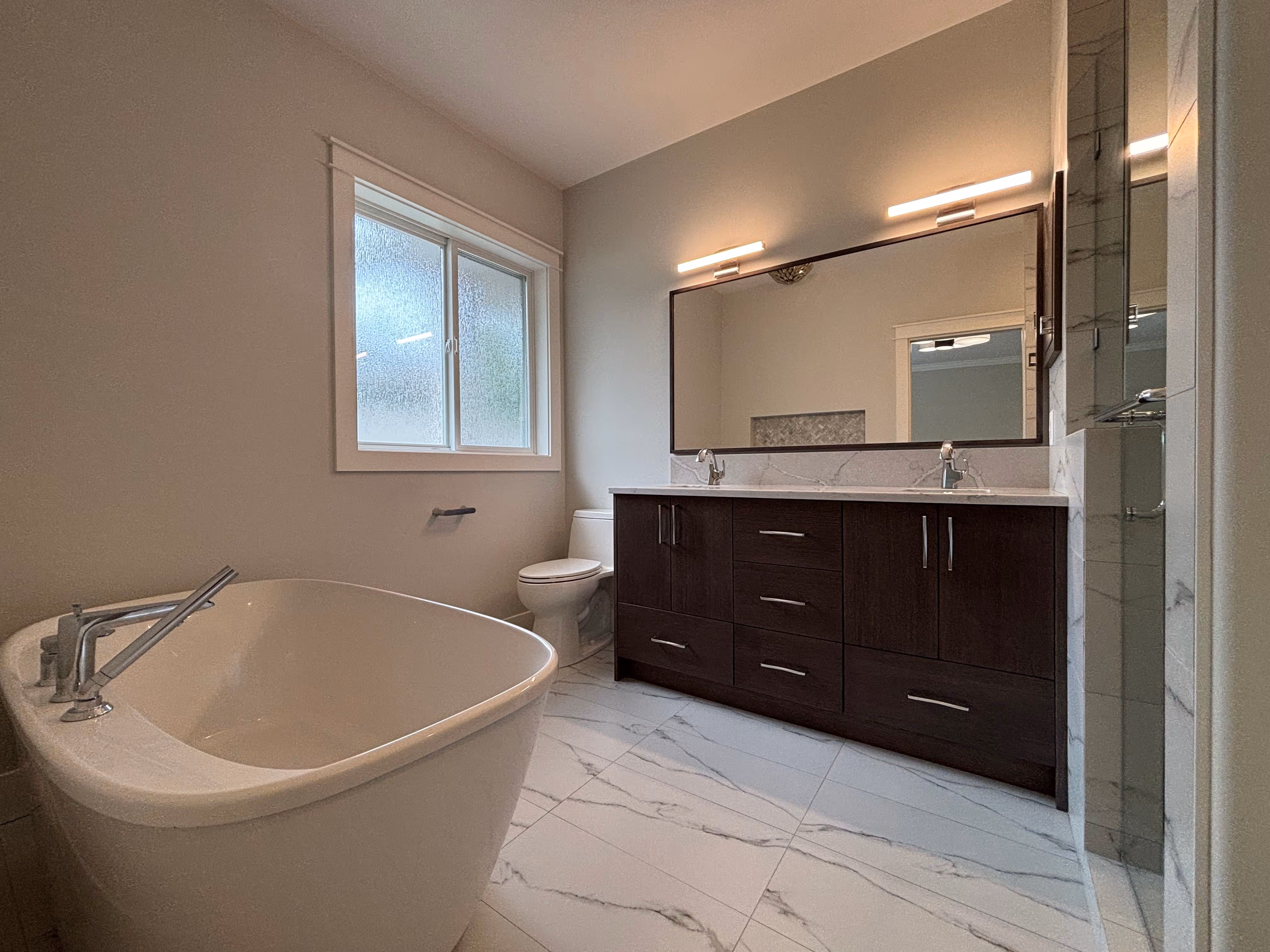 Master bedroom has a walk-in closet and a large ensuite with a separate tub and shower.
