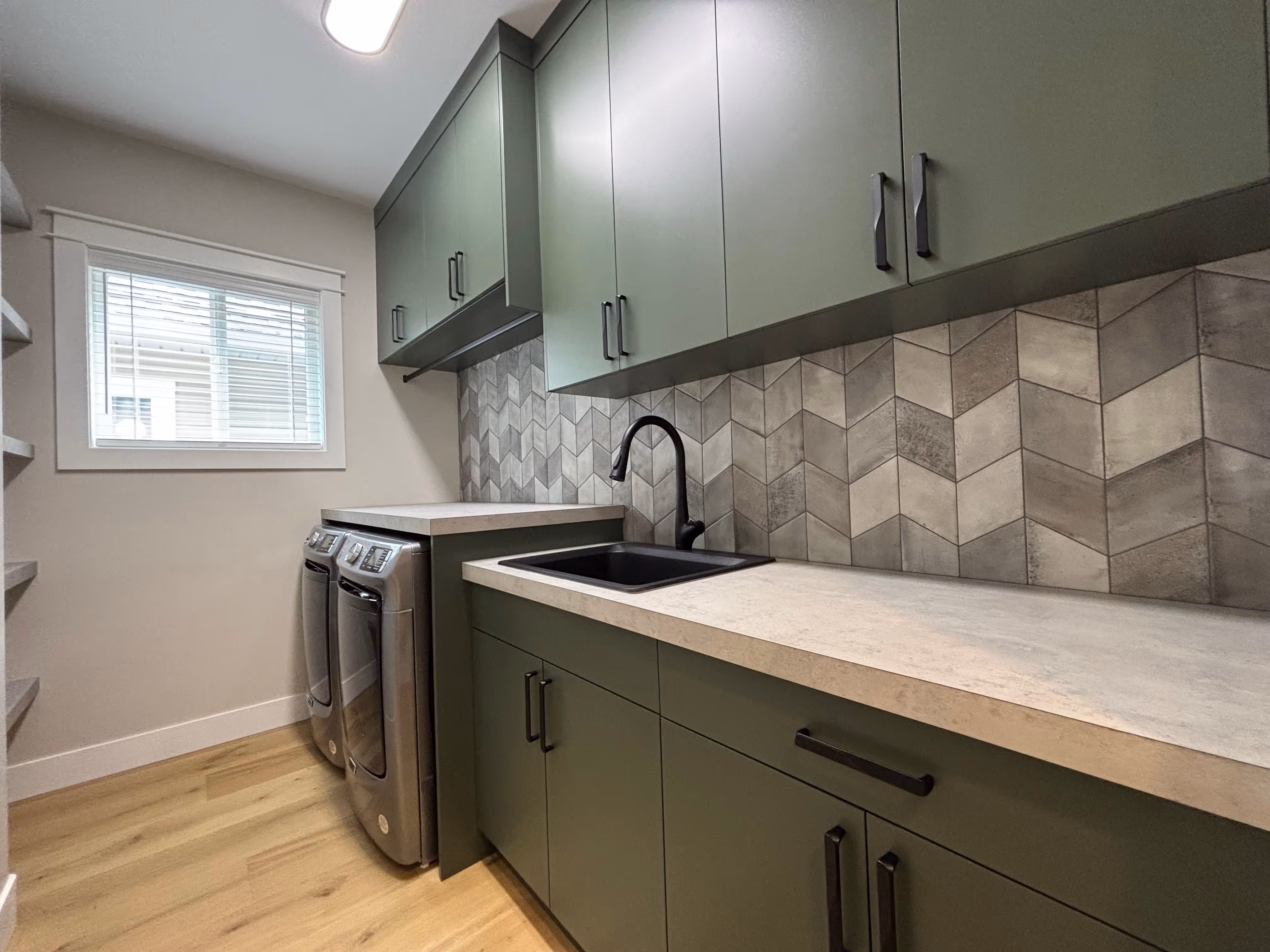 Laundry room has the washer and dryer, built-in cabinets and a sink.